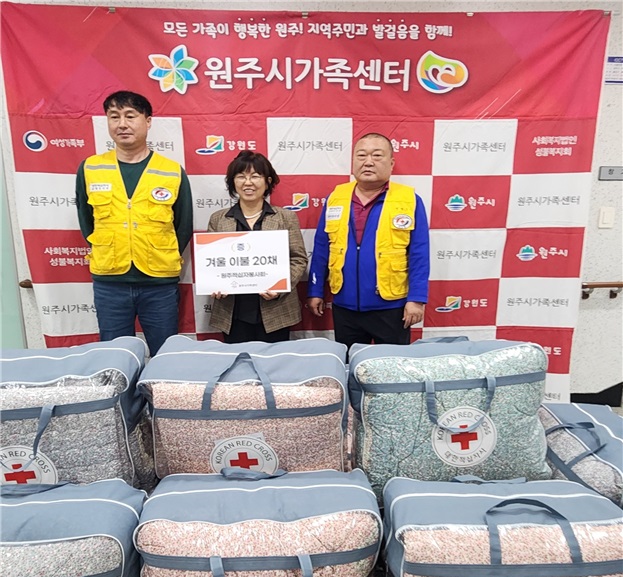 원주적십자봉사회는 지난 10월 19일 원주시가족센터에 겨울 이불 20채(200만원 상당)를 후원하였다. 겨울 이불은 다문화가족, 한부모가족 등 취약가족 20가정에게 대면 방식으로 전달되었다. 원주적십자봉사회는 "지역사회에 의미있는 봉사회가 되도록 노력하겠다"고 말했다.