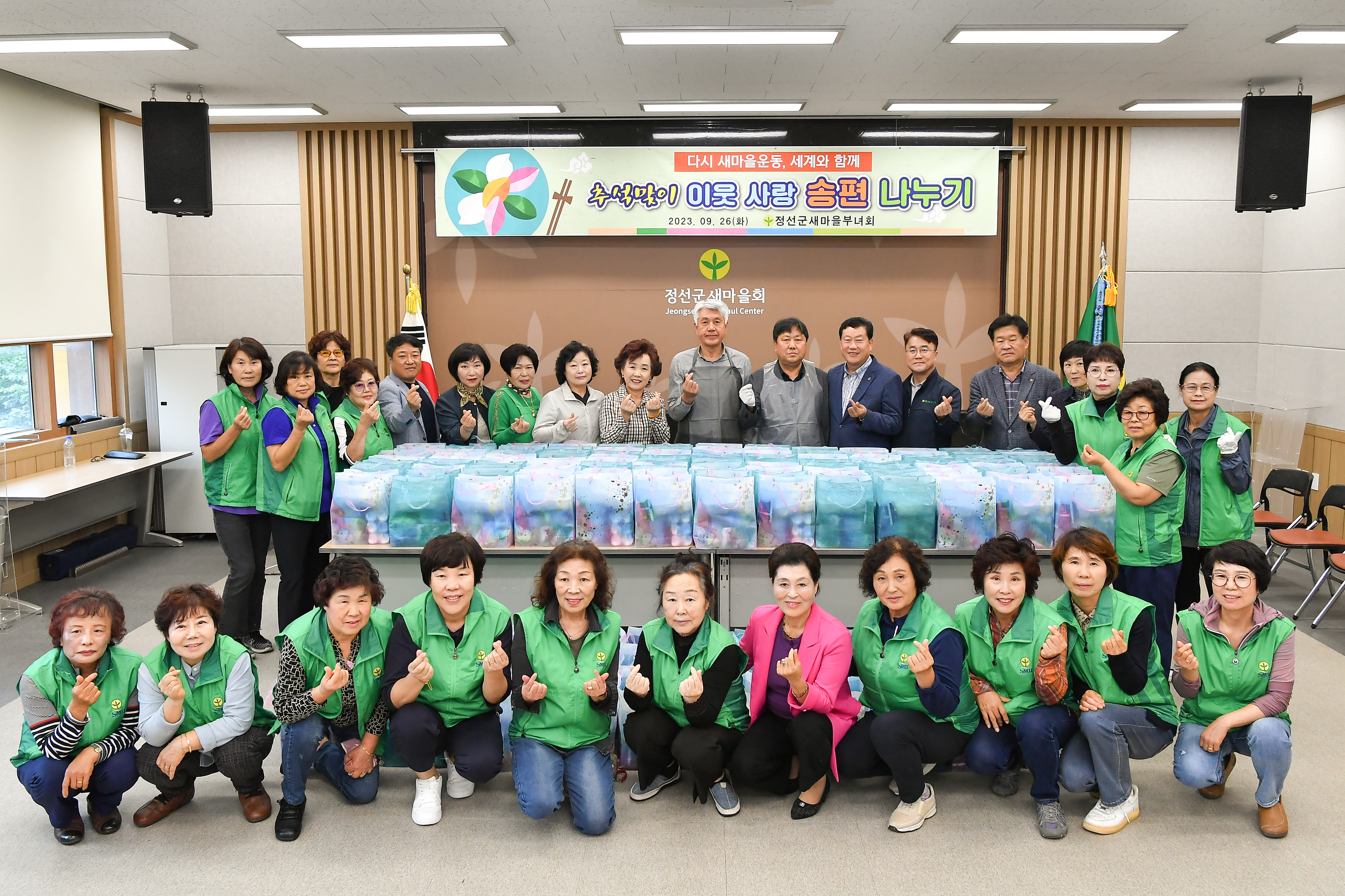 [강원사회복지신문 서은진 기자]=정선군 새마을부녀회(회장 김학순)는 지난 9월 26일 정선군새마을회관 2층 회의실에서 '추석맞이 이웃 사랑 송편 나누기' 행사를 실시했다. 이날 행사는 최승준 정선군수를 비롯해 새마을부녀회 회원 등 70여명이 참석해 소외된 이웃을 위한 나눔을 실천했다. 행사에 참여한 새마을부녀회 회...