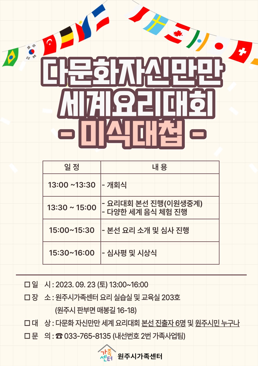 [강원사회복지신문 김도연 기자]=원주시가족센터(센터장 남궁은임)는 지난 9월 23일 오후 1시 원주시가족센터에서 다문화 자신만만 세계 요리대회 본선 '미식대첩'을 개최했다. 다문화 자신만만 세계 요리대회는 결혼이민자들이 참여하여 시민들에게 세계문화에 대해 알리고자 추진하는 행사다. 앞서 세계 요리 실습에서 배운...