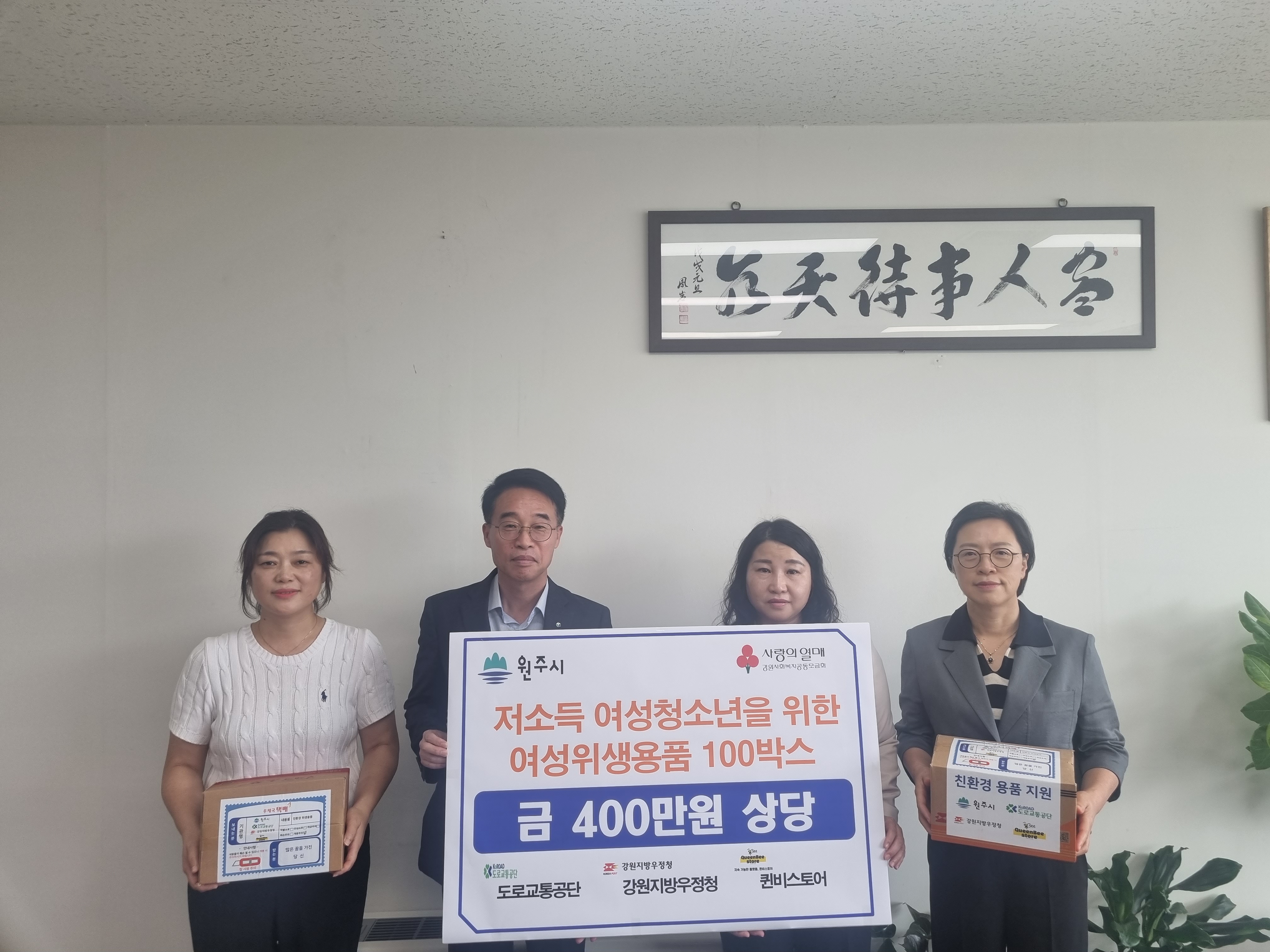 [강원사회복지신문 서은진 기자]=도로교통공단과 강원지방우정청, (주)퀸비스토어는 지난 9월 19일 원주시청 복지국장 집무실에서 친환경 여성위생용품 100박스(400만 원 상당)를 기부했다. 후원품은 사회복지공동모금회를 통해 저소득층에게 전달될 예정이다. 도로교통공단 이영재 ESG경영실장은 "어려움에 처한 지역 이웃과...
