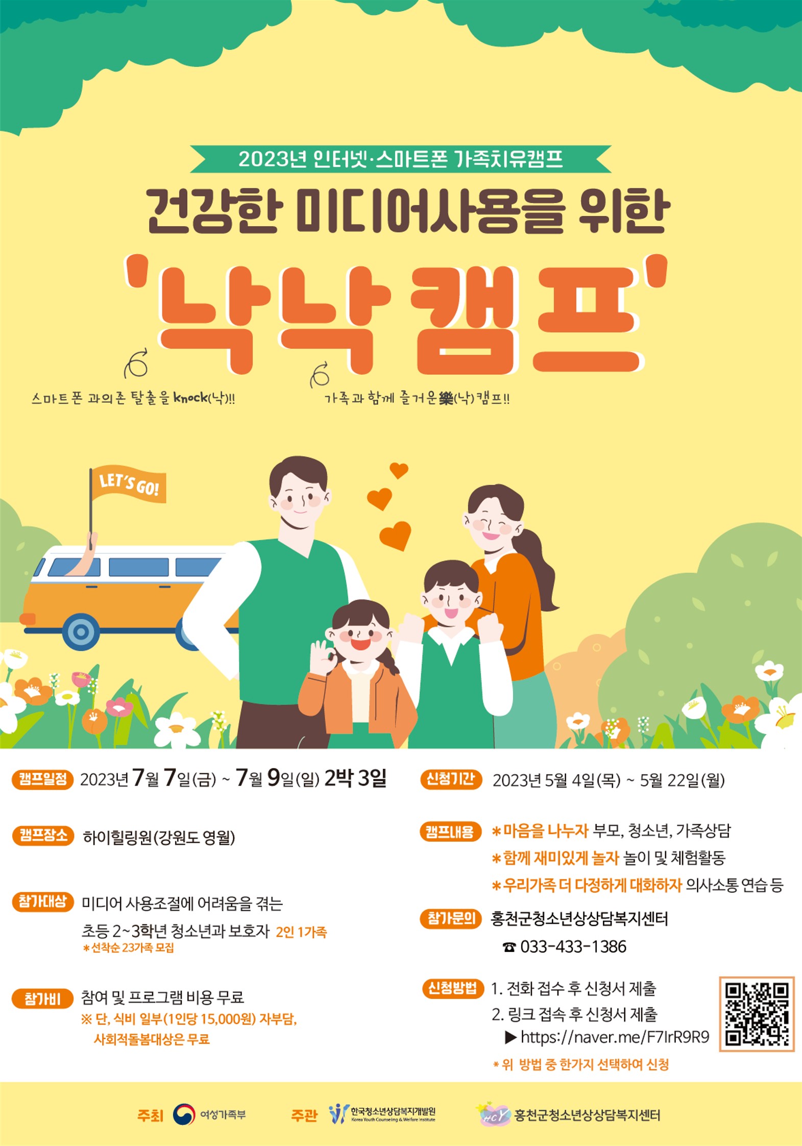 [강원사회복지신문 홍기한 기자]=홍천군청소년상담복지센터(센터장:허일)는 올해 여성가족부가 주최하고 한국청소년상담복지개발원이 공모한 2023년 청소년 인터넷·스마트폰 가족치유캠프 운영 기관으로 선정됐다. 가족치유캠프 '낙(knock)낙(樂) 캠프'는 2박 3일의 숙박형 프로그램으로 청소년의 건강한 미디어 사용을 주제...