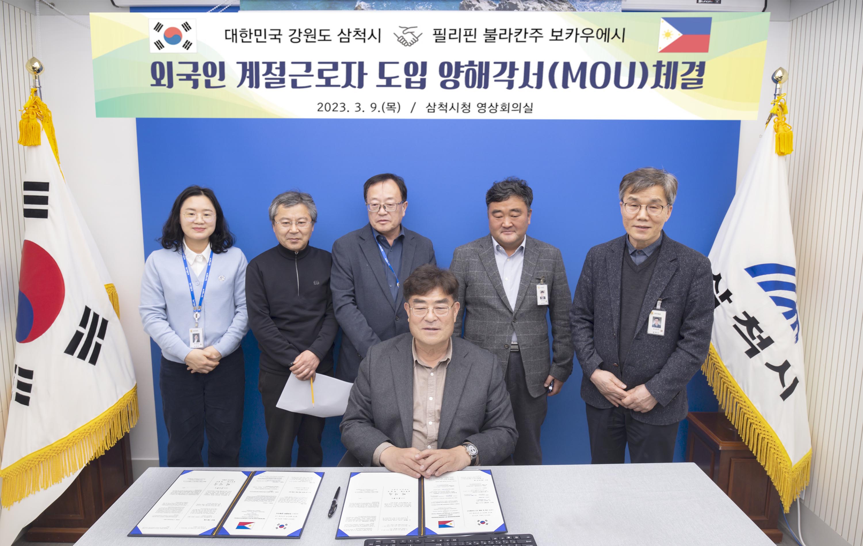 [강원사회복지신문 김종한 기자]=삼척시가 지난 3월 9일 15시 시청 영상회의실에서 농업경쟁력 향상과 농번기 일손 부족 해결을 위해 필리핀 불라칸주 보카우에시와 외국인 계절근로자 도입을 위한 업무협약을 체결했다. 이번 협약식은 삼척시와 보카우에시 간 온라인 화상회의를 통해 서면 협약으로 진행했다. 시는 협약 추...