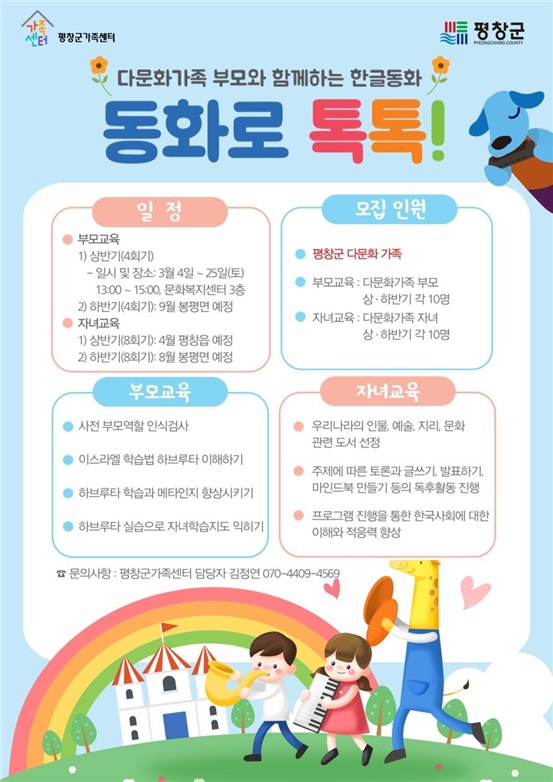 [강원사회복지신문 홍기한 기자]=평창군이 지원하는 평창군 가족센터는 지난 3월 4일(토)부터 다문화가족 부모와 함께하는 한글 동화 '동화로 톡톡' 사업을 시작한다고 밝혔다. 이 사업은 1학기(3~5월) 평창읍, 2학기(7~9월) 봉평면에서 진행될 예정이며, 학기별로 다문화가족 부모와 자녀 각 10명을 모집한다. 현재 1학기 자...