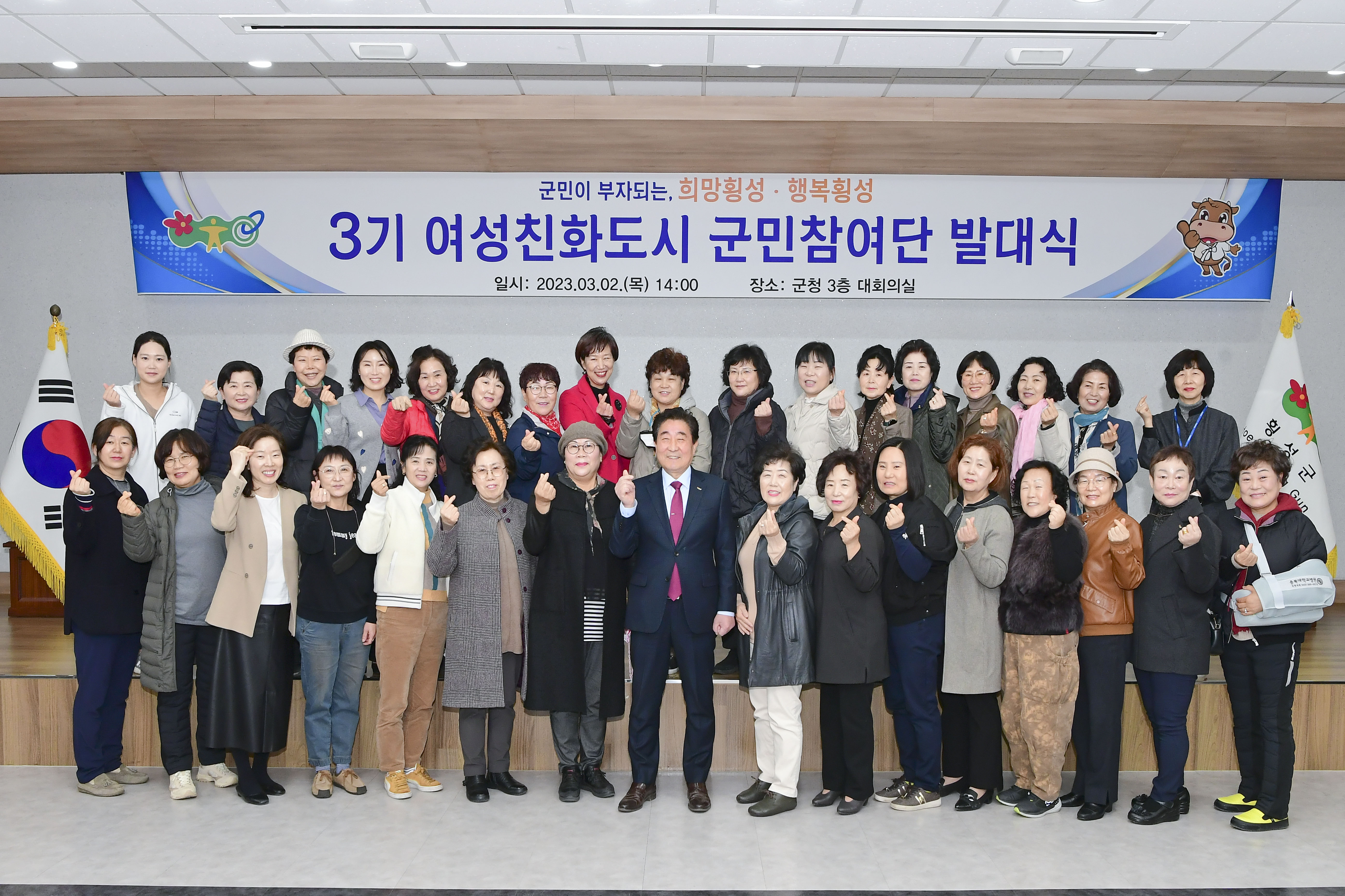 [강원사회복지신문 서은진 기자]=군민 모두가 행복한, 여성친화도시 횡성 조성에 박차 횡성군은 지난 3월 2일 14시 군청 3층 대회의실에서 3기 여성친화도시 군민참여단 발대식을 개최한다. 발대식에서는 군민참여단 위촉장 수여, 여성정책에 대한 설명과 '여성친화도시 이해'란 주제로 교육이 있을 예정이다. 위촉된 군민참...
