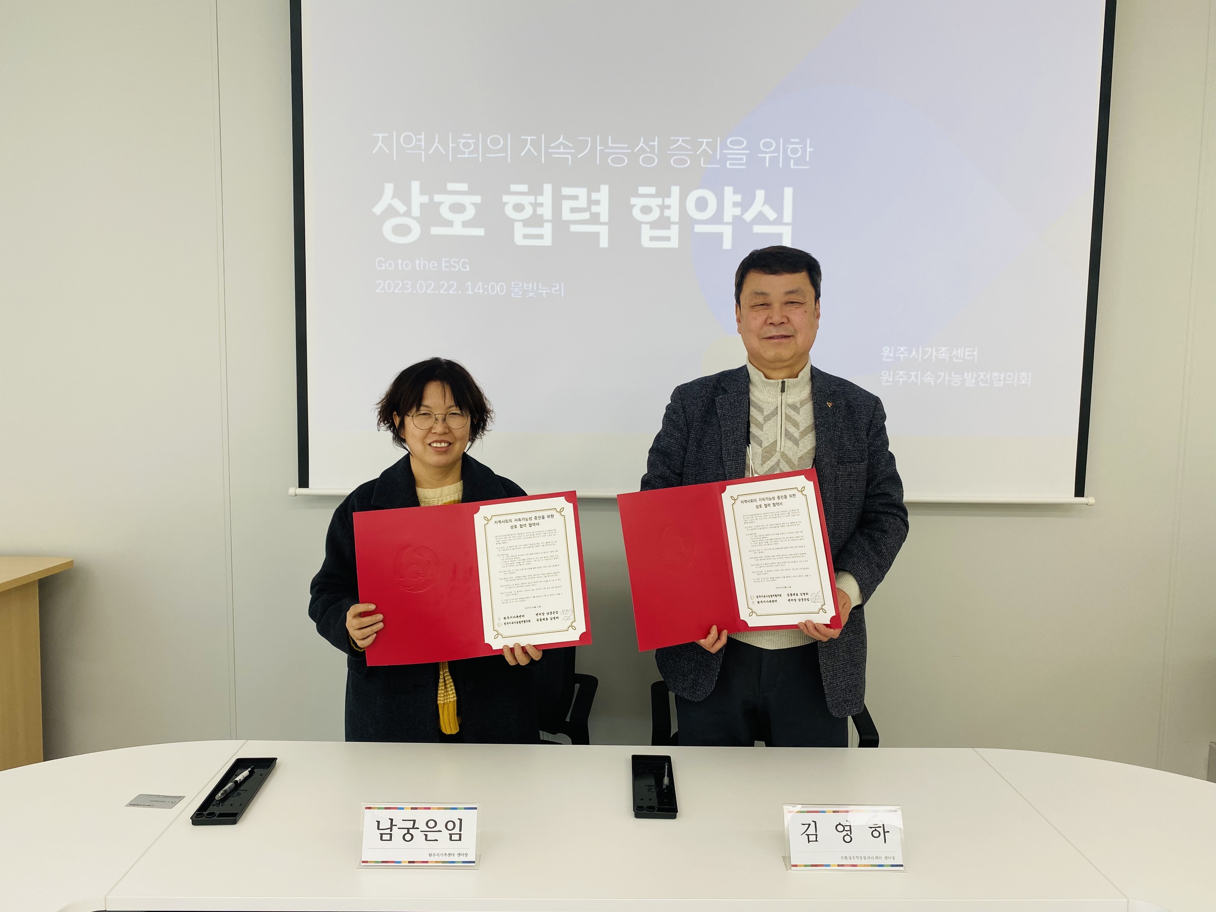 [강원사회복지신문 서은진 기자]=원주시가족센터(남궁은임 센터장)는 지난 2월 22일 친환경유역통합관리센터 물빛누리에서 원주지속가능발전협의회(김영하 공동대표)와 지역사회의 지속가능성 증진을 위한 상호 협력 협약을 진행하였다. 이에, 원주시가족센터 공동육아나눔터 2호점과 물빛누리에서 5월~11월에 초등학생을 대...