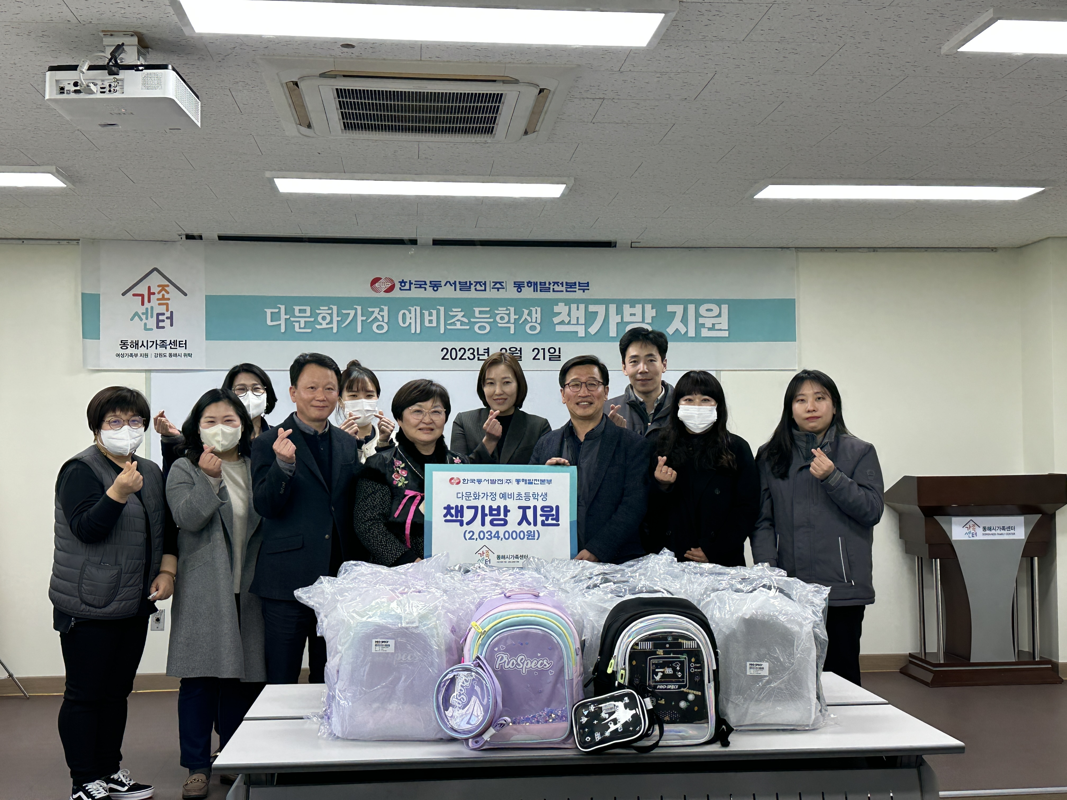 [강원사회복지신문 김종한 기자]=한국동서발전(주) 동해발전본부 후원 동해시가족센터(센터장 우미강)는 지난 2월 21일 센터에서 다문화가정 예비초등학생을 위한 책가방 전달식을 가졌다고 밝혔다. 이번에 전달된 책가방은 한국동서발전(주) 동해발전본부에서 200만원 상당의 가방 18개를 후원, 동해시 관내 예비초등학생을...
