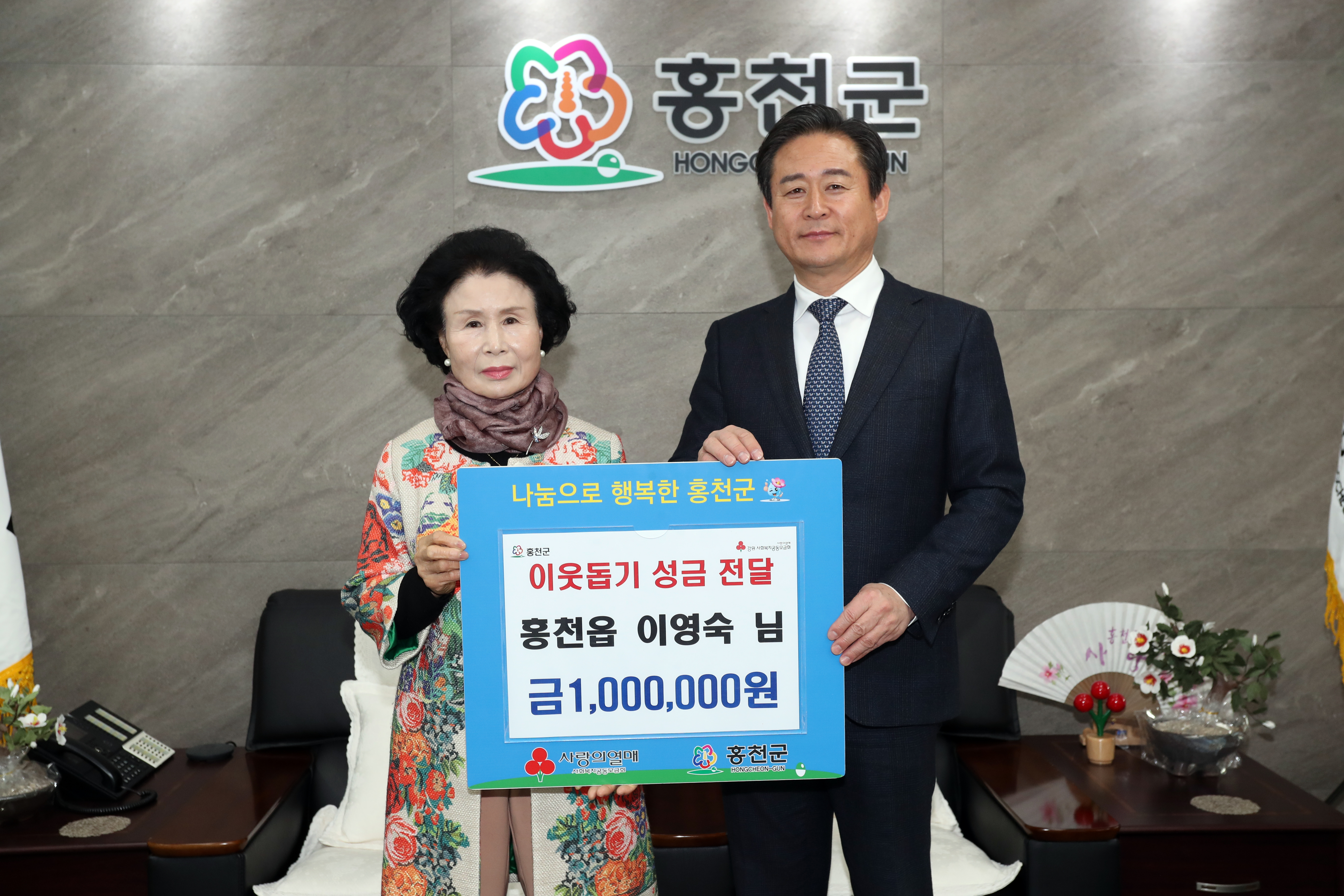[강원사회복지신문 홍기한 기자]=홍천읍에 거주하고 있는 이영숙씨는 지난 2월 8일 홍천군청을 방문해 이웃돕기 성금 100만원을 전달했다. 이영숙씨는 그동안 도움이 필요한 이웃들을 일일이 찾아다니며 꾸준한 이웃사랑을 실천했으며, 매일 조금씩 모아놓은 돈을 어려운 이웃을 위한 성금으로 흔쾌히 기탁했다. 신영재 홍천...