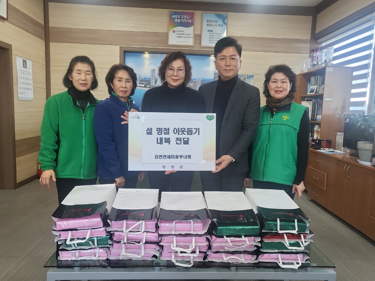 [강원사회복지신문 김종한 기자]=양양군 강현면새마을부녀회(회장 이금선)는 지난 1월 18일 설 명절 이웃돕기로 강현면사무소에 내복 22벌을 기증하였다. 이금선 회장은 "강현면 지역 내 어렵게 지내시는 분들이 따뜻하게 겨울을 나시라고 기증하게 되었다"고 말했다.