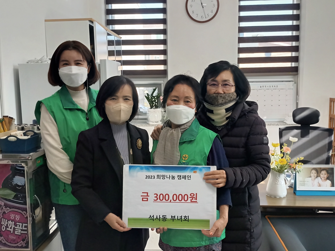 [강원사회복지신문 김도연 기자]=춘천시 석사동새마을부녀회(회장 구길회)는 지난 1월 25일 춘천시 석사동행정복지센터(동장 박성숙)를 방문해 관내 소외된 이웃을 위한 성금 30만원을 전달했다.