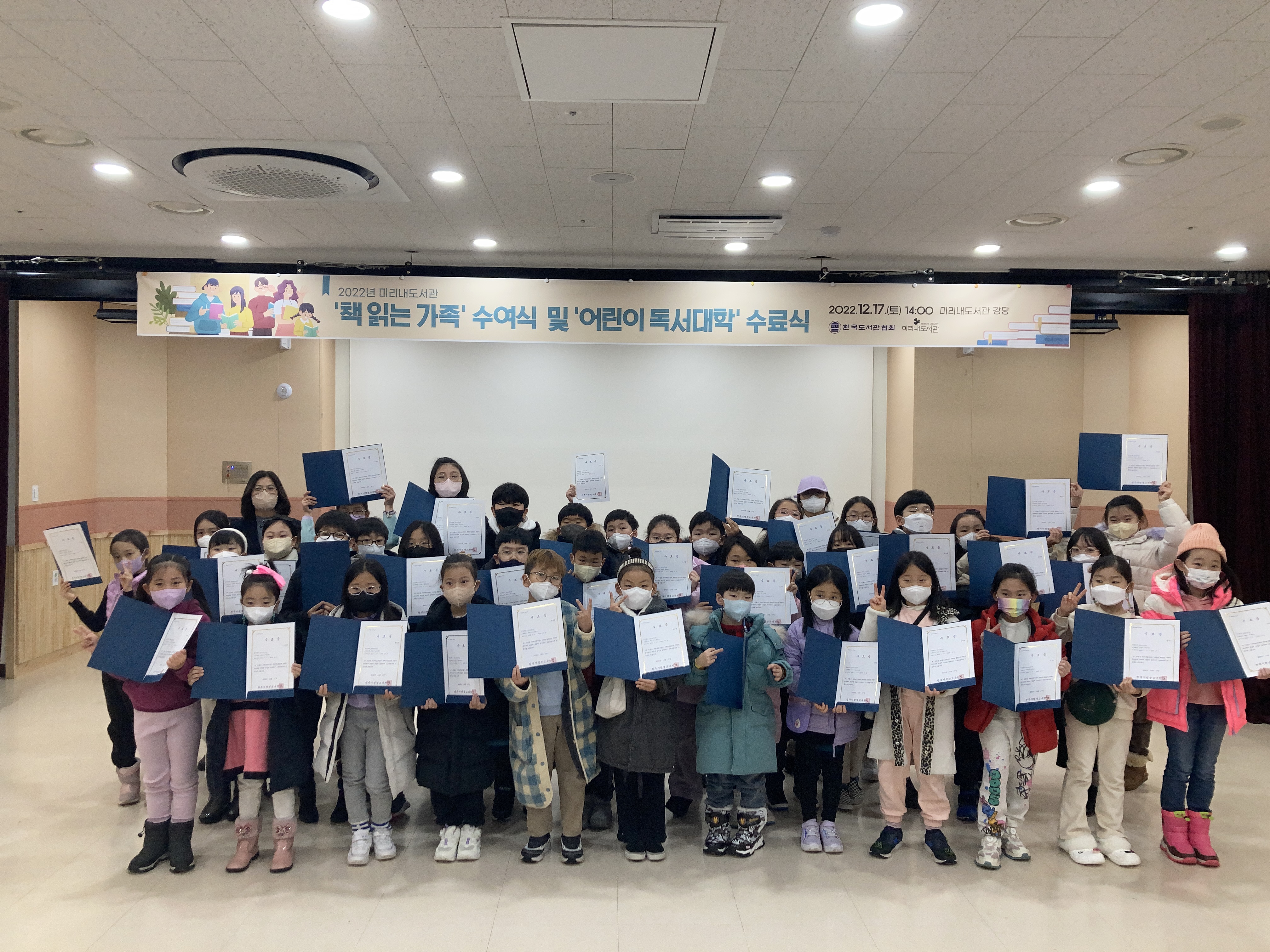 [강원사회복지신문 서은진 기자]=원주 미리내도서관은 지난 12월 17일 도서관 1층 강당에서 '책 읽는 가족' 인증서 수여 및 '어린이 독서대학' 수료식을 개최했다. '책 읽는 가족'은 매년 한국도서관협회에서 가족 단위 독서 생활을 증진하기 위해 도서관의 추천을 받아 인증서를 수여하는 사업이다. 미리내도서관은 올해 '책...