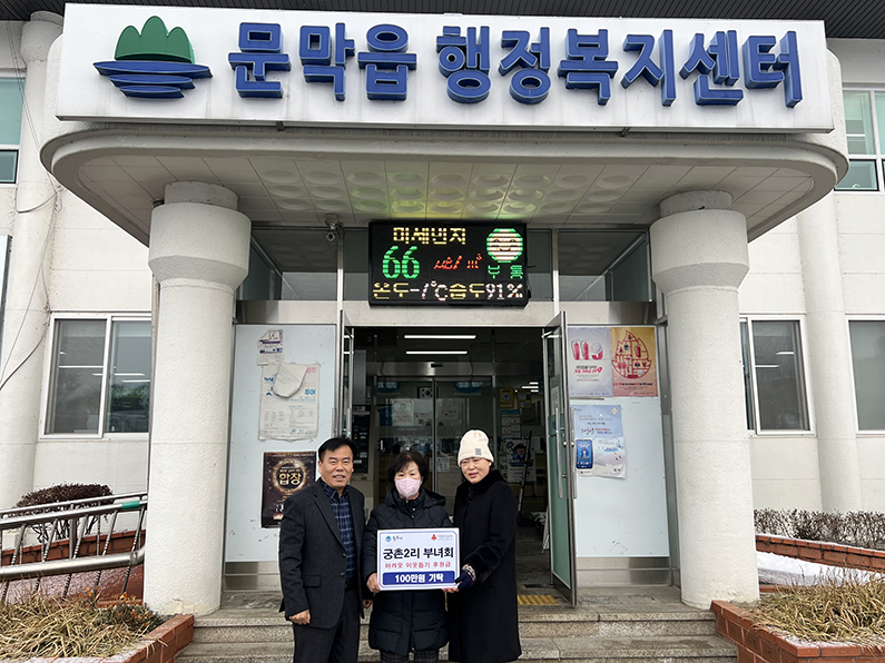 [강원사회복지신문 서은진 기자]=원주시 문막읍 궁촌2리부녀회(회장 조영미)는 지난 12월 28일 문막읍 행정복지센터를 방문해 어려운 이웃을 돕는데 써달라며 희망2023나눔캠페인 성금 100만 원을 기부했다. 조영미 회장은 "코로나19 장기화로 어려움을 겪고 있는 이웃들에게 조금이라도 정을 나눌 수 있는 기회가 돼 기쁘게...