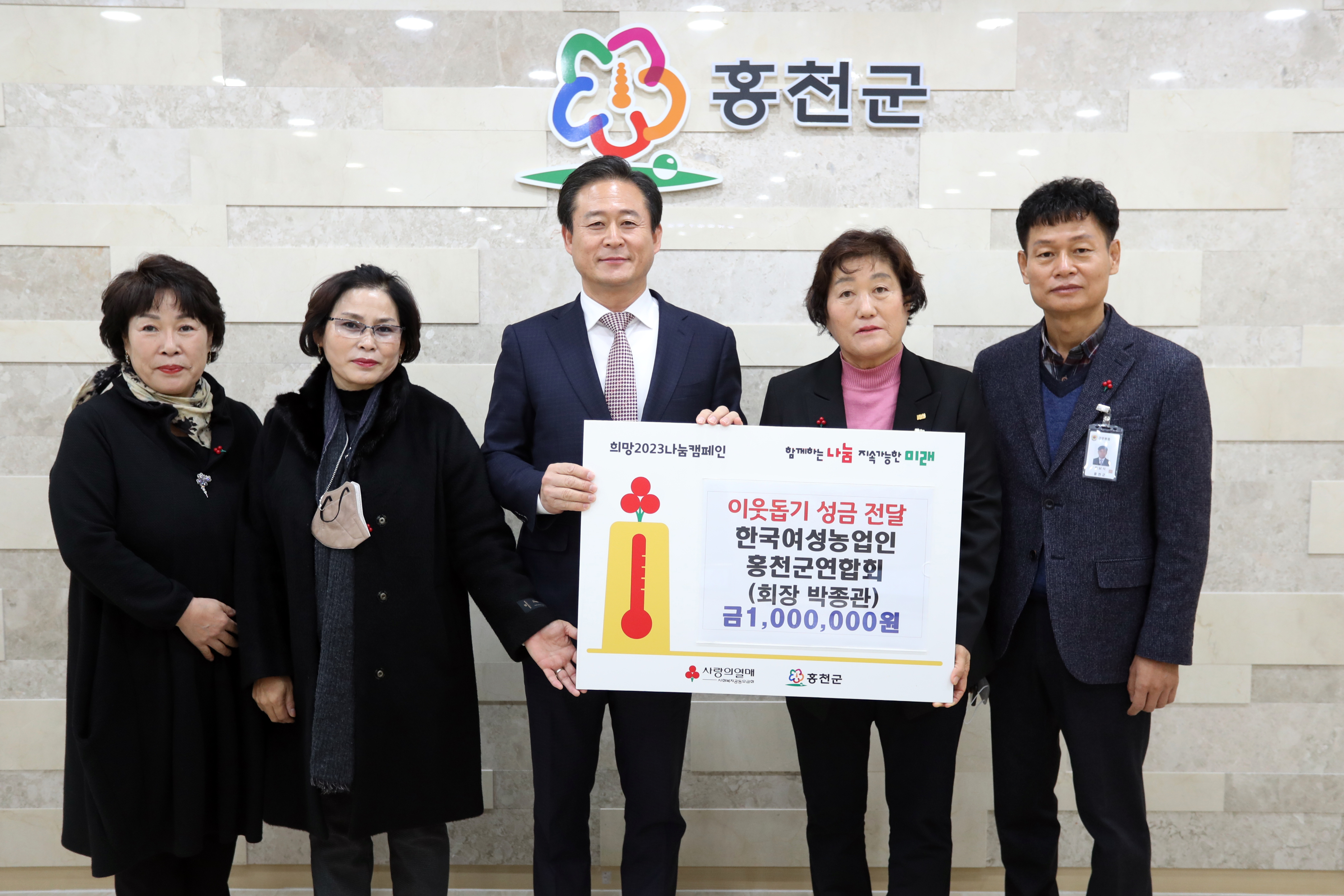 [강원사회복지신문 김도연 기자]='희망2023나눔캠페인'에 지역 사회단체, 기업의 기부 행렬이 이어지고 있다. 한국여성농업인 홍천군연합회(회장 박종관)는 지난 12월 19일 홍천군청을 방문해 '희망2023나눔캠페인' 이웃돕기 성금 100만원을 기탁했다. 신영재 홍천군수는 "한파가 맹위를 떨치는 가운데에도 따듯한 관심으로 ...