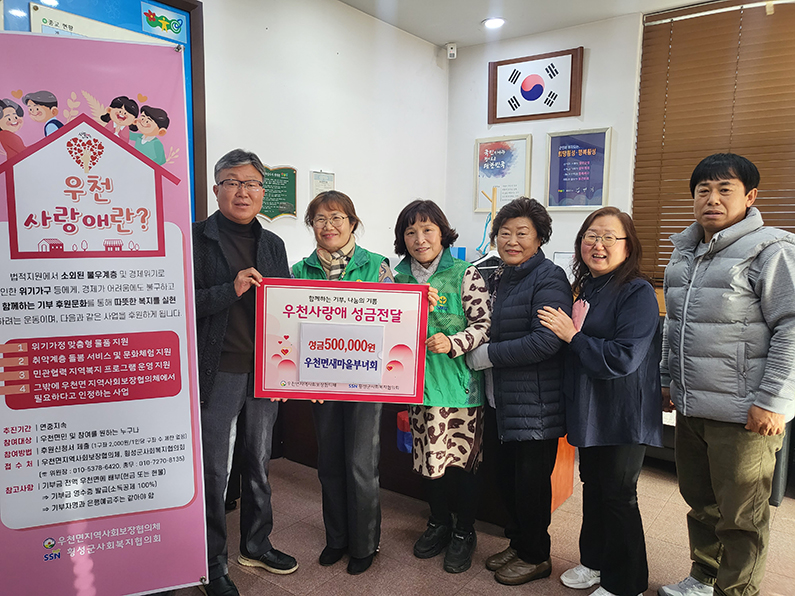 [강원사회복지신문 이정환 기자]=횡성군 우천면새마을부녀회(회장 홍정숙)는 지난 12월 20일 연말을 맞아 어려운 이웃을 위해 써달라며 성금 50만원을 기탁했다 이날 기탁된 성금은 우천면새마을부녀회가 직접 페트병을 모아 마련한 수익금으로 우천면새마을부녀회 홍정숙 회장은 "작은 정성이지만 추운 날씨에 꽁꽁 얼어붙은...
