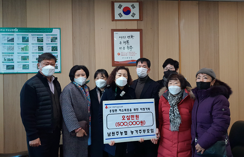 [강원사회복지신문 김도연 기자]=남원주농협 농가주부모임(회장 이명애)은 지난 12월 19일 원주시 흥업면 행정복지센터를 찾아 희망2023나눔캠페인 이웃돕기 성금 50만 원을 지정기탁했다. 이명애 회장은 "떡 판매 수익금으로 마련한 성금을 흥업면 관내 어려운 이웃에게 써달라"며 따뜻한 마음을 전했다. 이연섭 면장은 "코...