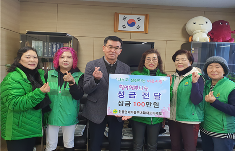 [강원사회복지신문 홍기한 기자]=횡성군 안흥면 새마을부녀회(대표 이복희) 지난 12월 19일 안흥면행정복지센터를 방문하여 지역내 어려운 이웃을 위해 써달라며 100만원의 성금을 기탁했다. 기탁된 성금은 관내 저소득층 및 복지사각지대에 있는 어려운 이웃을 돕는데 뜻깊게 쓰여질 예정이다.