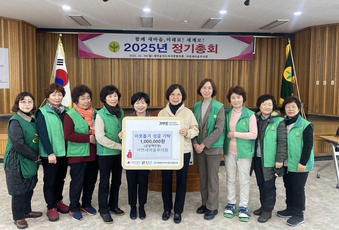 철원군 서면 새마을부녀회(회장 유미자)는 2025년 새해를 맞아 개최한 새마을 정기총회에서 불우이웃 성금 100만원을 서면사무소에 기탁하였다. 유미자 새마을부녀회장은 “2025년 새해를 맞이하여 우리 지역의 어려운 분들에게 작게나마 희망이 되었으면 하는 마음에서 다같이 마음을 모았다”고 밝혔다.
