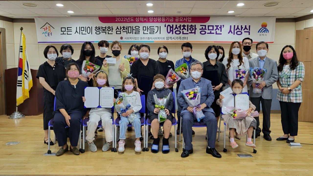 [강원사회복지신문 김종한 기자]=삼척시가 여성친화도시로서, 시민의 관심을 높이기 위해 '여성친화 공모전' 시상식을 지난 8월 30일 삼척시종합사회복지관 4층 대강당에서 가졌다. 이번 시상식은 삼척시가족센터 주관으로 삼척시 양성평등기금을 지원받아 모든 시민이 행복한 삼척마을 만들기 위한 공모전을 진행하였다. 여...