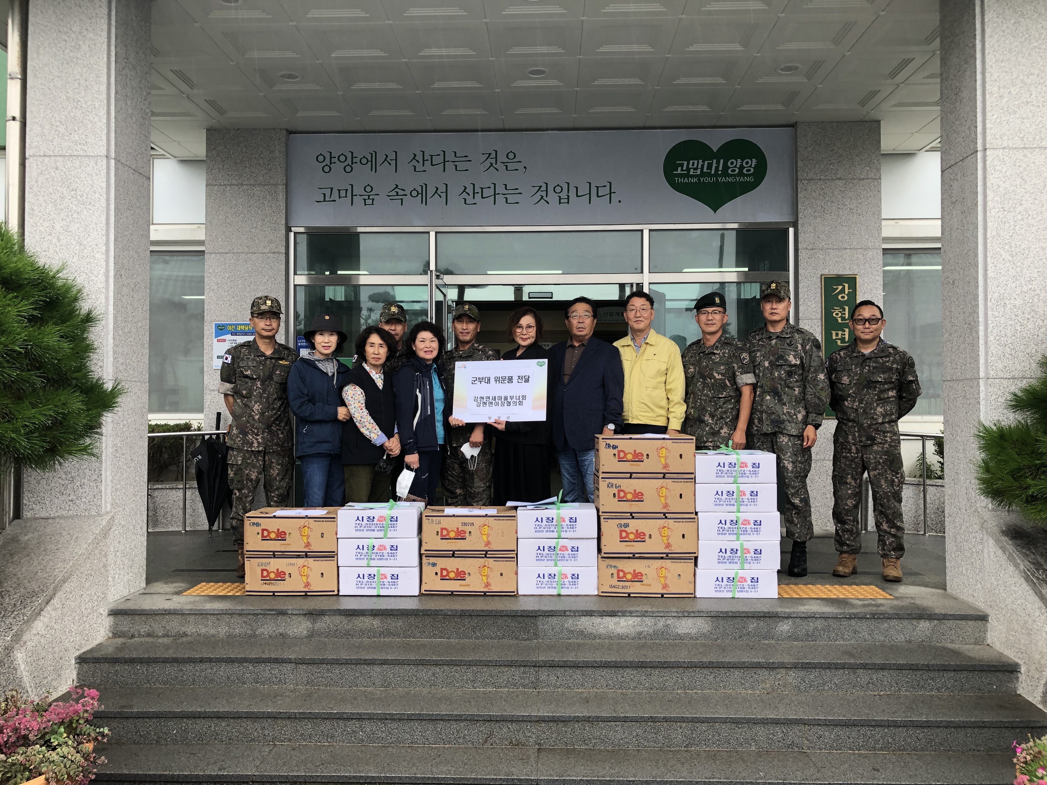 [강원사회복지신문 김종한 기자]=양양군 강현면새마을부녀회(회장 이금선) 및 강현면이장협의회(회장 박경용)에서는 지난 9월 5일 양양군 강현면사무소에서 강현면 군부대(3개부대)에 떡과 과일을 전달하여 추석맞이 군장병을 위문했다.