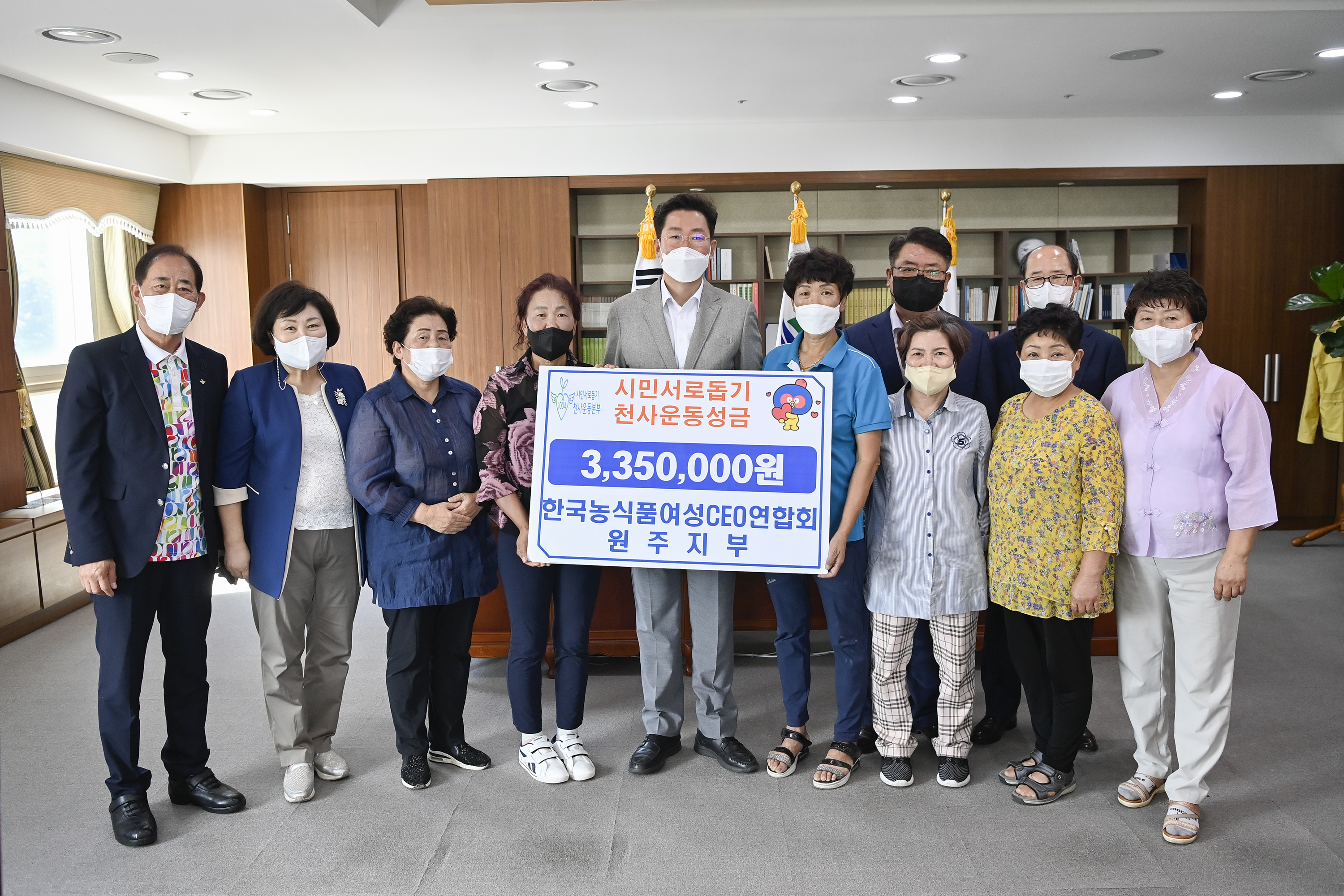 [강원사회복지신문 이정환 기자]=한국농식품여성CEO연합회 원주지부(회장 조재숙)는 지난 9월 2일 시장집무실에서 시민서로돕기 천사운동 후원금(3,350천원)을 기탁했다. 이날 전달식에는, 한국농식품여성CEO연합회 조재숙 회장 및 회원 7명, 지은희 천사운동본부장, 김길선 천사지킴이 회장이 참석했다. 후원금은 시민서로돕...