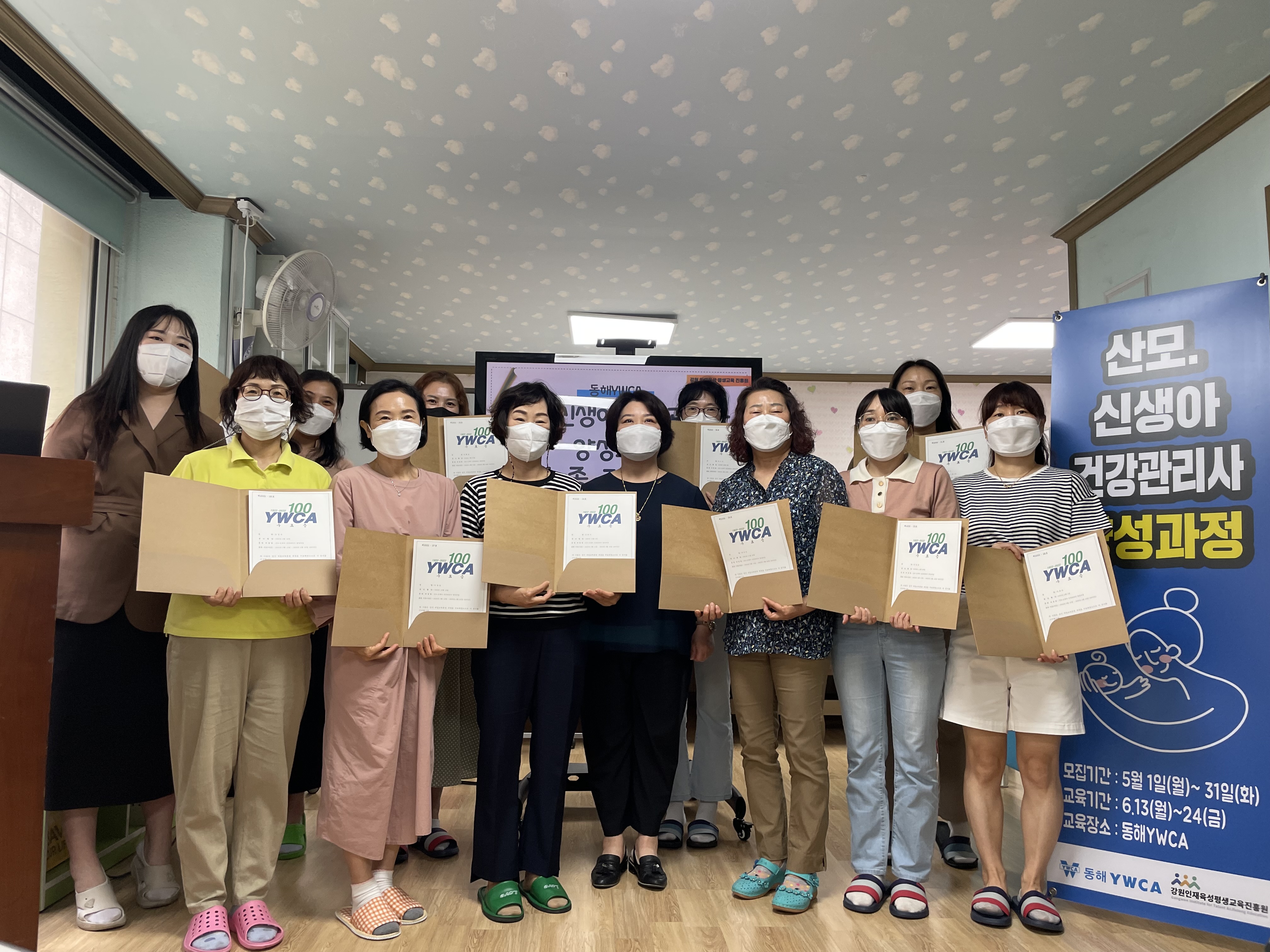 [강원사회복지신문 김종한 기자]=동해YWCA는 경력단절여성을 전문인력으로 양성하는 강원인재육성평생교육진흥원에서 시행하는 평생교육 직업훈련과정 공모사업으로 진행된 '산모.신생아건강관리사 양성과정' 종강식이 지난 6월 24일(금) 오후 12시부터 동해YWCA 2층 소강당에서 진행되었다. 산모·신생아 건강관리사란 임신...