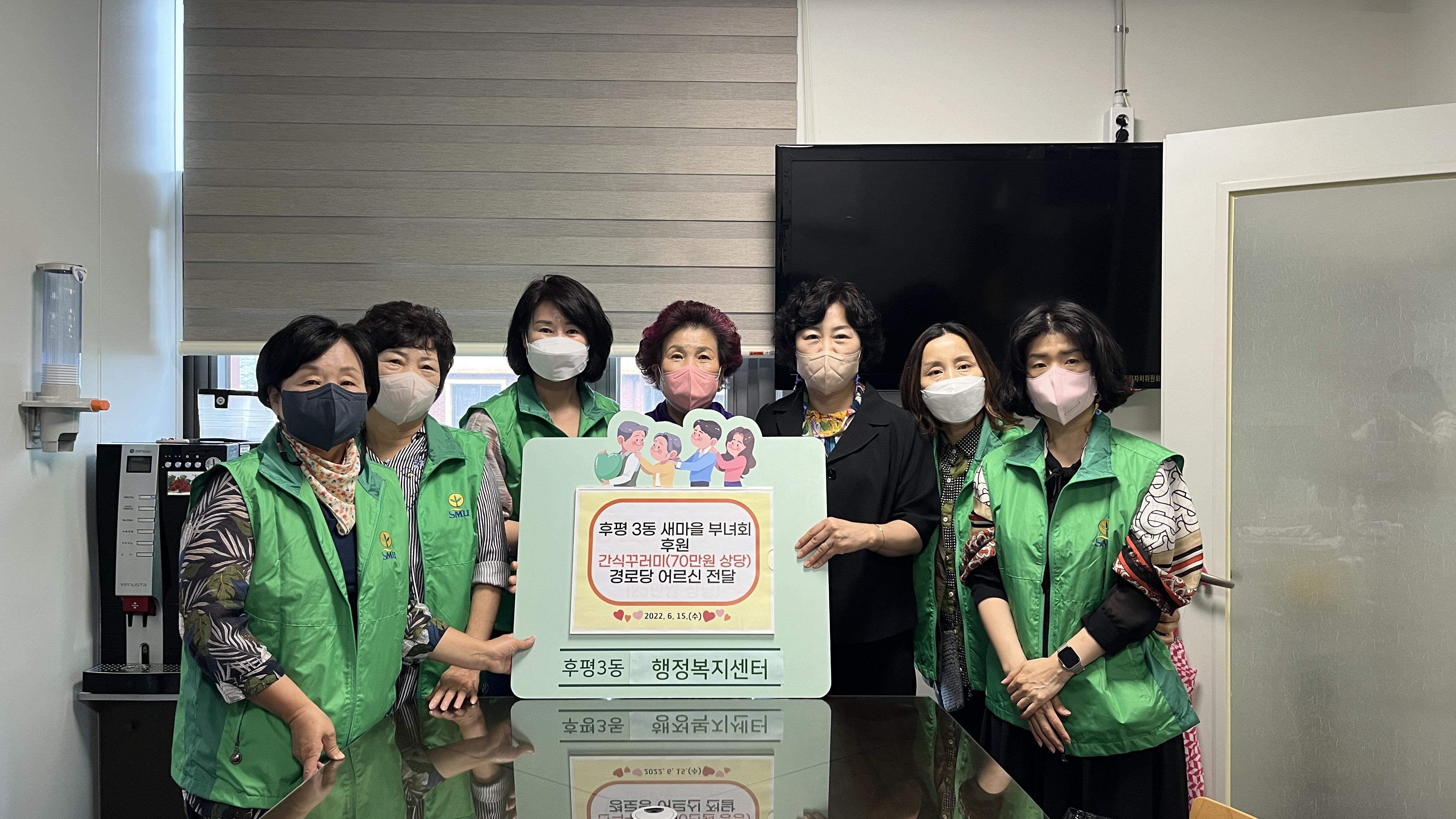 [강원사회복지신문 서은진 기자]=춘천시 후평3동 새마을부녀회(회장:장미화)는 지난 6월 15일 경로당 어르신들을 위해 70만원 상당의 간식꾸러미를 전달했다.