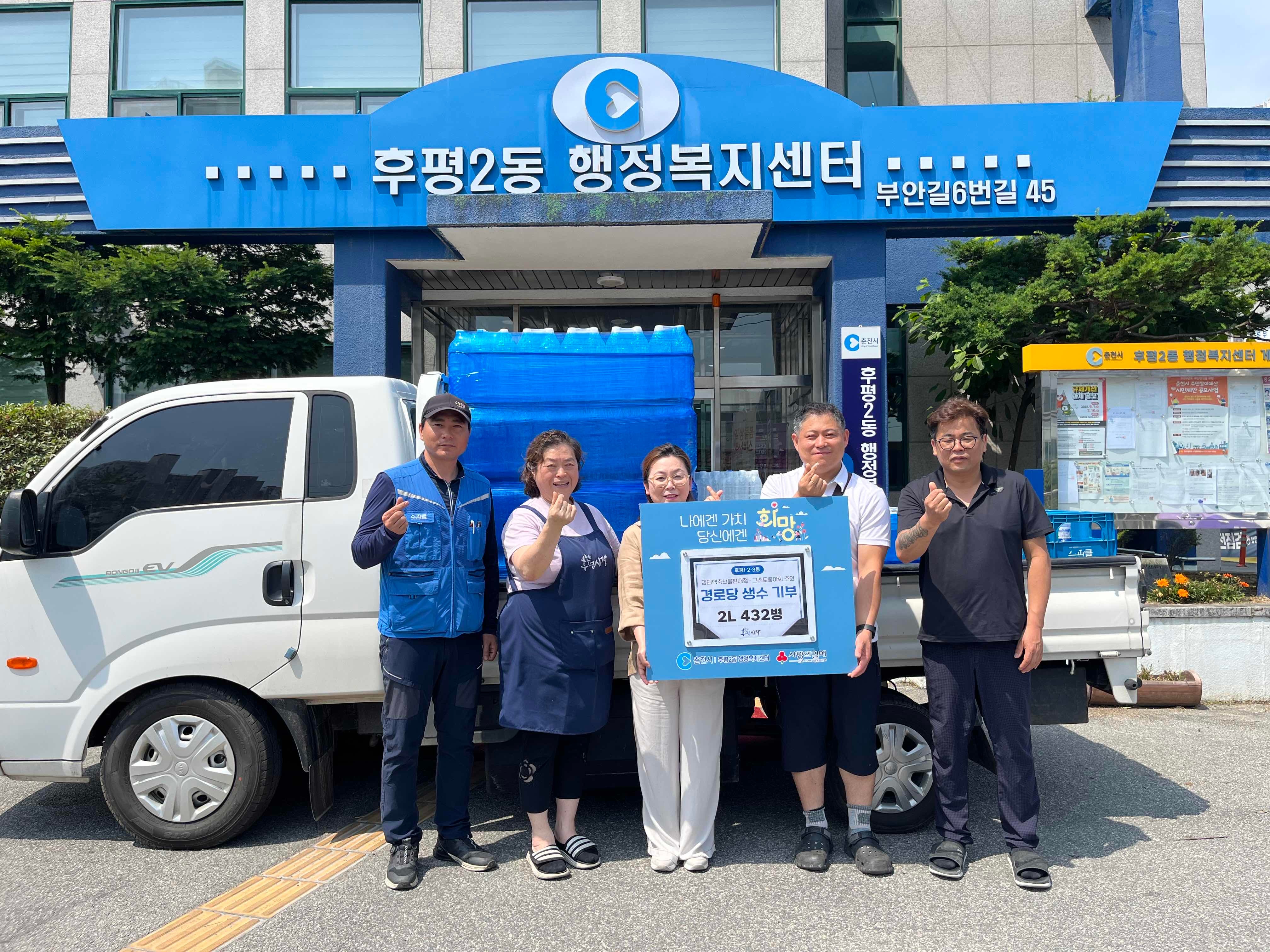 김태백축산물판매장(대표 김태백)과 그래도좋아회(대표 김완) 업체가 6월 19일 춘천시 후평2동행정복지센터(동장 마화선)에 2L 생수 432병을 후원했다. 두 업체는 무더위에 취약한 어르신들이 보다 쾌적하고 건강하게 여름을 보낼 수 있도록 돕기 위해 생수를 후원했다. 생수는 후평1·2·3동 경로당 36개소에 전달됐다. 김태...