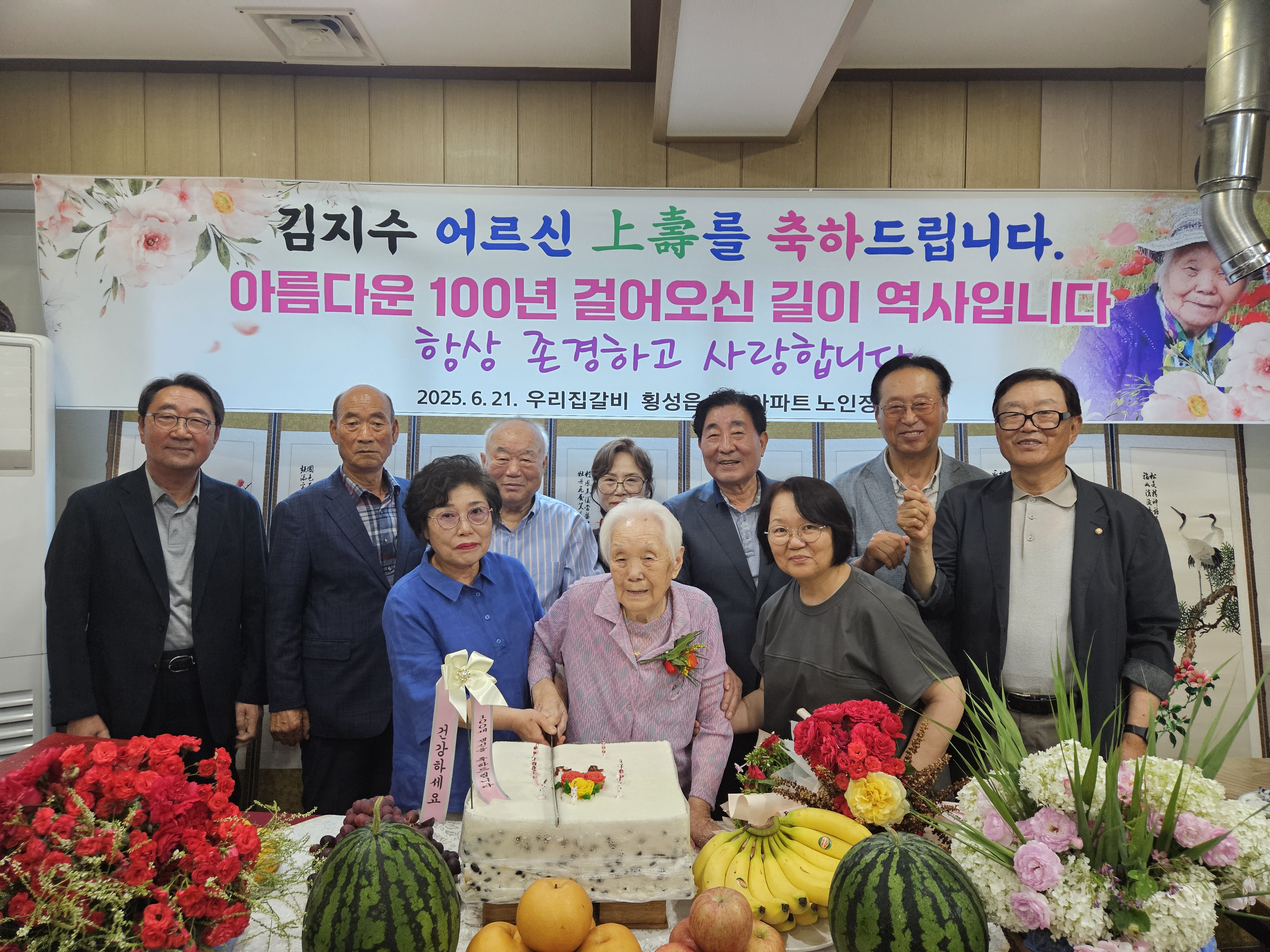 6월 21일 횡성읍 대동아파트 경로당(이창진 노인회장)에서 지역 어르신의 장수를 축하하는 뜻깊은 자리가 열린다. 80여 명의 대동아파트 경로당 회원들이 ‘김지수 어르신’이 100세를 맞이함에 따라 장수 축하를 위해 오래전부터 행사를 마련했다. 특히 경로당 노인회원인 이금예 국악인의 구성진 노래도 준비돼 자리를 빛낼...