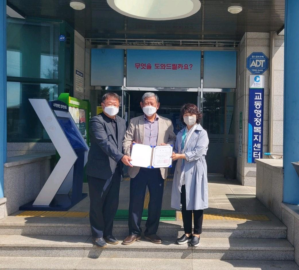 [강원사회복지신문 홍기한 기자]=춘천북부노인복지관(관장:박재호)은 지난 4월 26일 2021년 세대공감 행복나눔 캠페인 기증서를 춘천시 교동행정복지센터(동장:김춘옥)에 전달했다.
