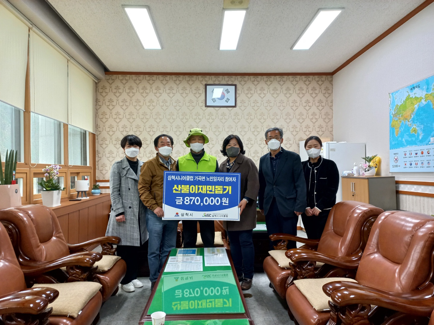[강원사회복지신문 김종한 기자]=삼척시니어클럽(관장 김성래) 가곡면 노인일자리 참여자 등은 지난 4월 14일 오후 가곡면 행정복지센터를 방문하여 산불피해를 입은 이재민 지원에 힘써 달라며 성금 87만 원을 기탁했다.