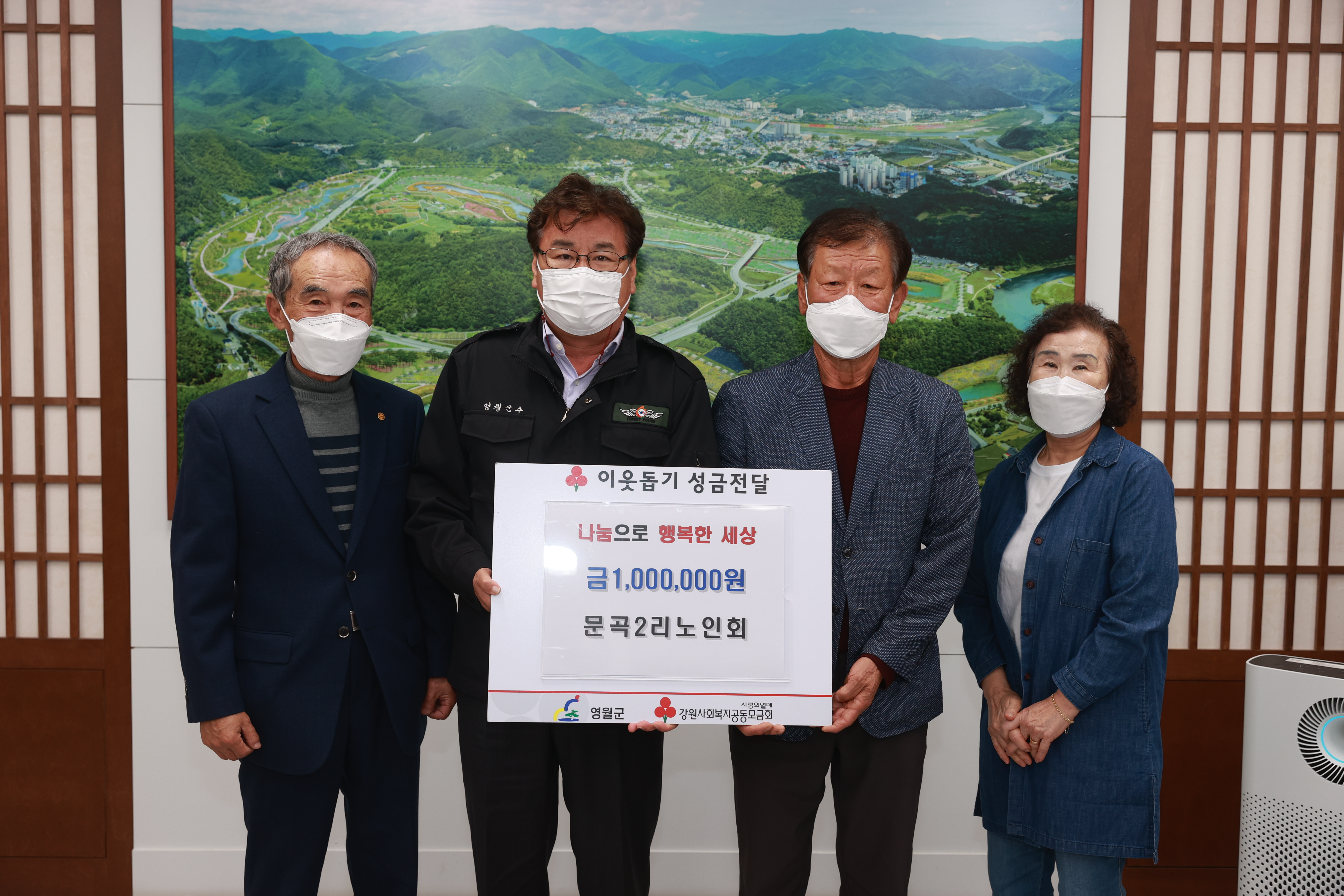 [강원사회복지신문 이정환 기자]=영월군 북면 문곡2리노인회(회장 엄재일)는 지난 4월 14일 영월군청을 찾아 저소득 소외계층을 위해 써달라며 성금 100만원을 기탁했다.