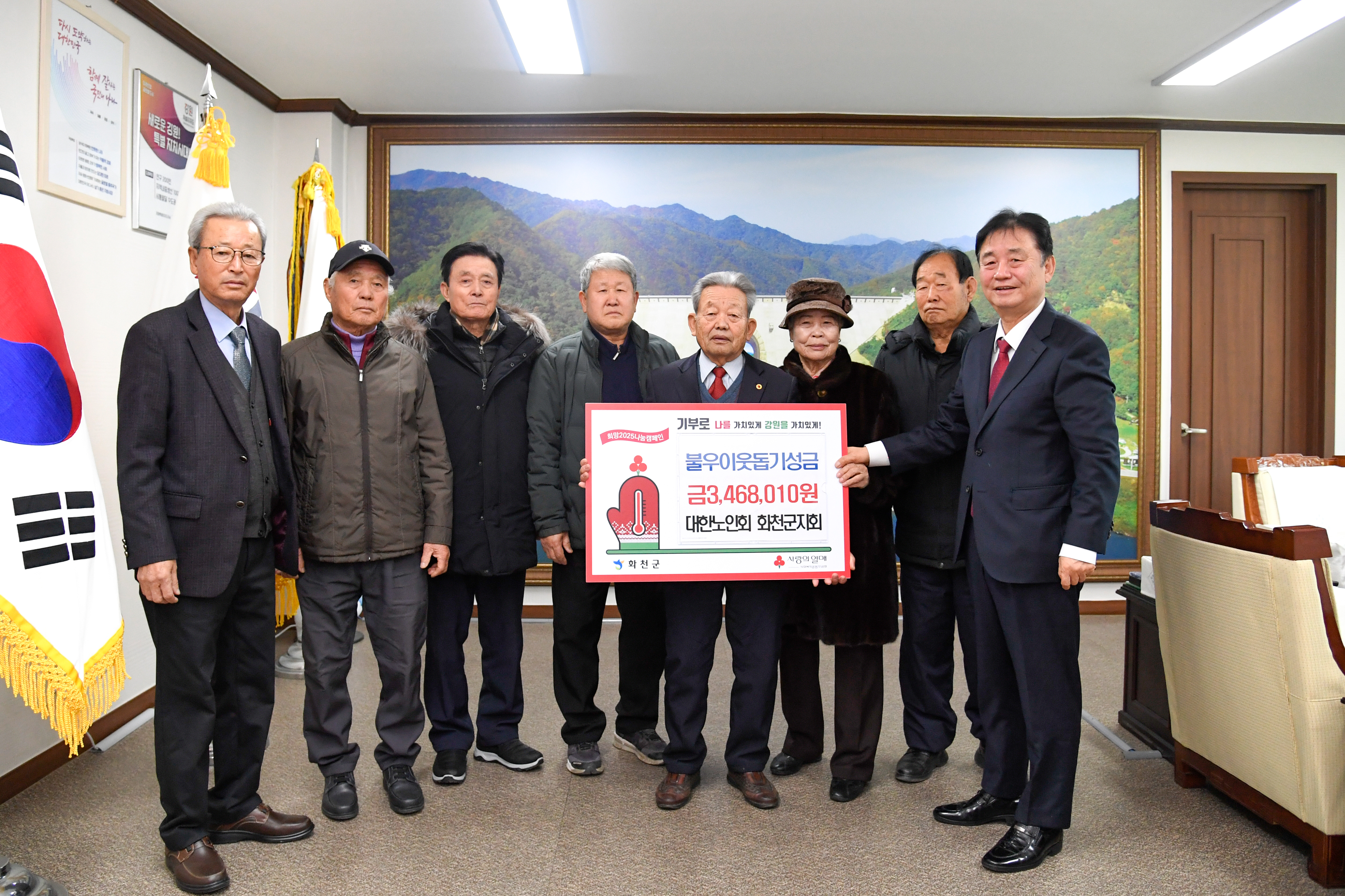대한노인회 화천군지회(회장:이화원)는 지난 12월 31일 최문순 군수를 방문해 이웃돕기 성금 346만8,010원을 기탁했다.