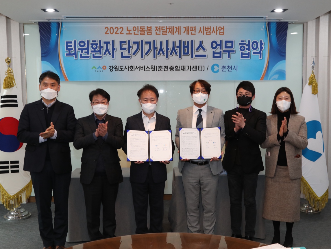 [강원사회복지신문 홍기한 기자]=춘천시정부, 강원도사회서비스원과 퇴원환자 단기가사서비스 협약 체결 장기요양등급 없는 퇴원환자 대상 전국 최초 단기가사서비스 제공 노인돌봄 전달체계의 새로운 도약을 꿈꾸는 춘천시정부가 퇴원환자 단기가사서비스 운영에 시동을 걸었다. 춘천시정부는 지난 2월 7일 강원도사회서비스...