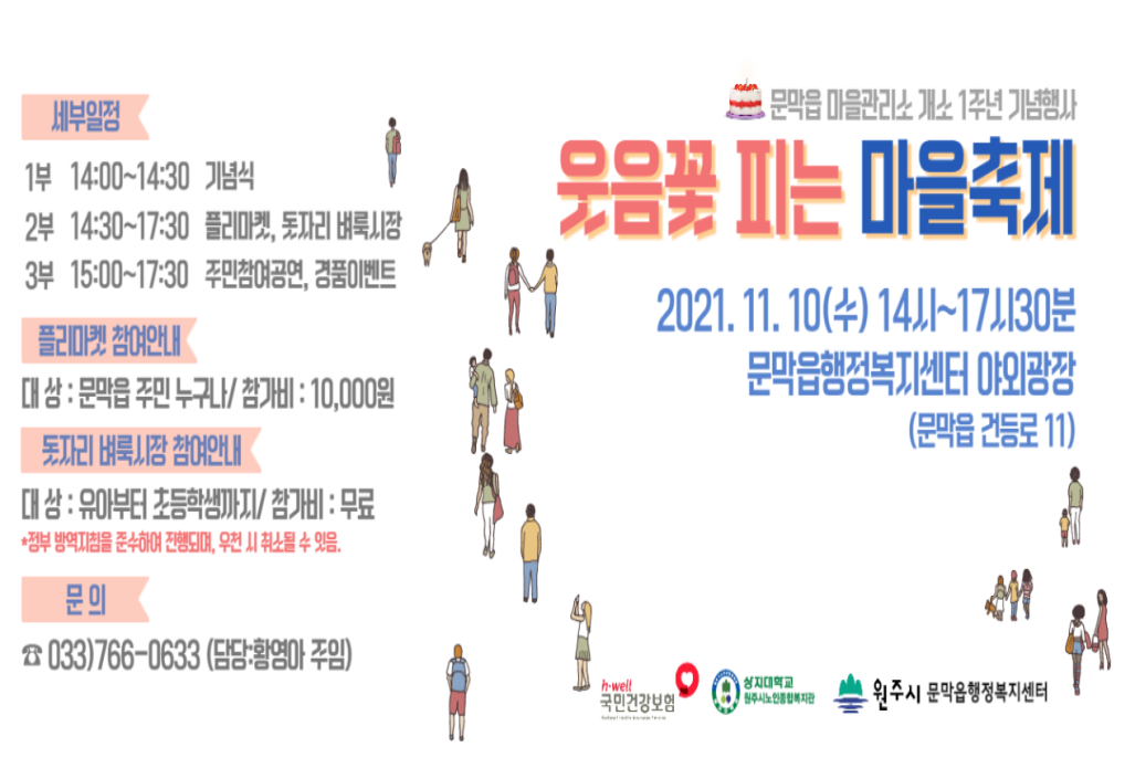 [강원사회복지신문 서은진 기자]=원주시노인종합복지관(관장 용석찬) 문막읍 마을관리소는 오는 11월 10일(수) 오후 2시부터 5시 30분까지 문막읍 행정복지센터 광장에서 어린이, 어르신, 다문화가족 등 다양한 세대가 함께하는 '웃음꽃 피는 마을축제'를 개최한다. 문막읍 마을관리소는 국민건강보험공단 임직원들이 기부한...