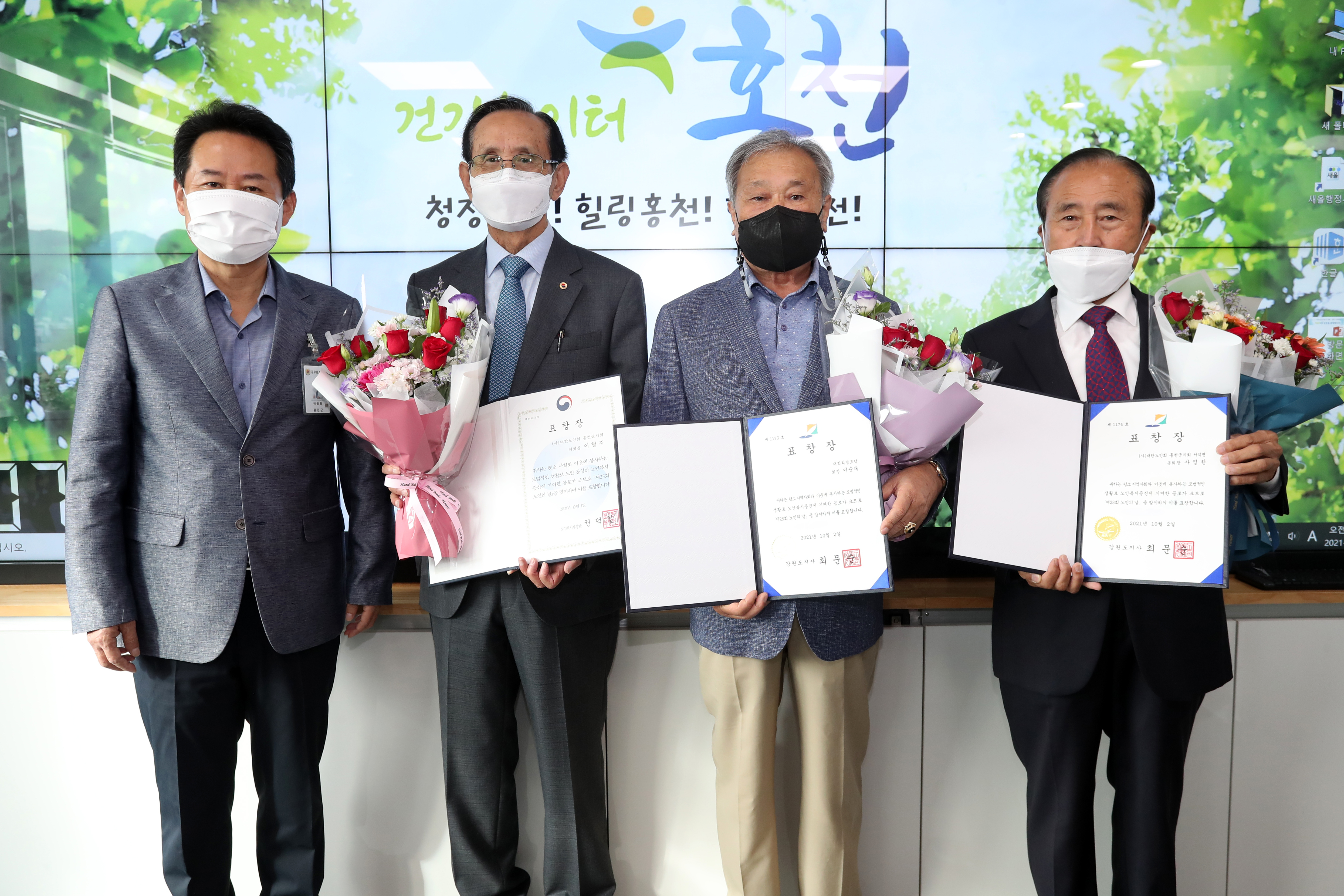 [강원사회복지신문 홍기한 기자]=홍천군은 지난 10월 14일 2021년 노인의 날 기념 노인복지증진 유공자에 대한 포상을 수여했다. (왼쪽부터) 이형주 대한노인회 홍천군지회장은 보건복지부장관 표창을 수상했으며, 이순재 태학리경로당 회장과 사영한 서석면분회장은 각각 강원도지사 표창을 수상했다.