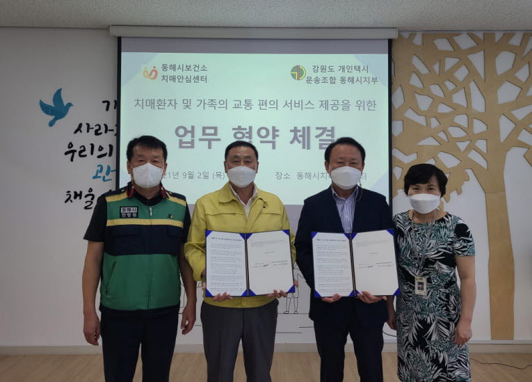 [강원사회복지신문 김종한 기자]=치매환자 및 가족 대상 교통 편의 서비스 제공 동해시(시장 심규언)는 지난 9월 2일 동해시치매안심센터에서 개인택시운송사업조합 동해시지부와 '치매 환자 및 가족 대상 교통편의 서비스 제공'을 위한 업무협약을 체결했다고 밝혔다. 이번 협약은 지역 내 택시조합을 통해 치매 프로그램 대...