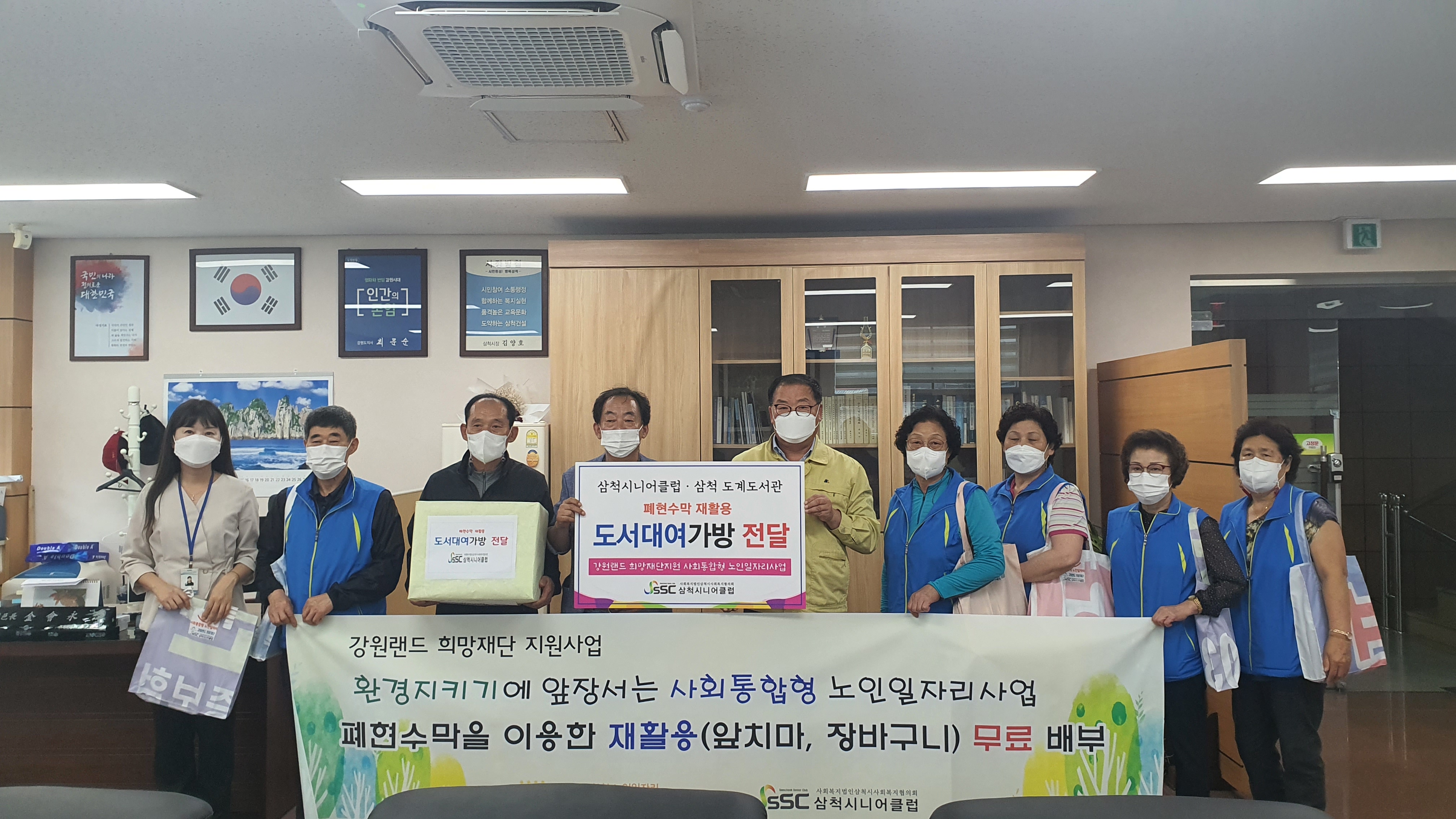 [강원사회복지신문 김종한 기자]=삼척시니어클럽회(관장 김성래)은 '강원랜드 희망재단 지원사업의 사회통합형 노인일자리 사업'의 일환으로 폐현수막을 이용한 도서용 가방 50점을 도계읍행정복지센터 도계도서관에 기증했다. 이 가방은 소진될 때까지 도계도서관을 이용하는 누구나 무료로 받을 수 있다. 삼척시니어클럽에...