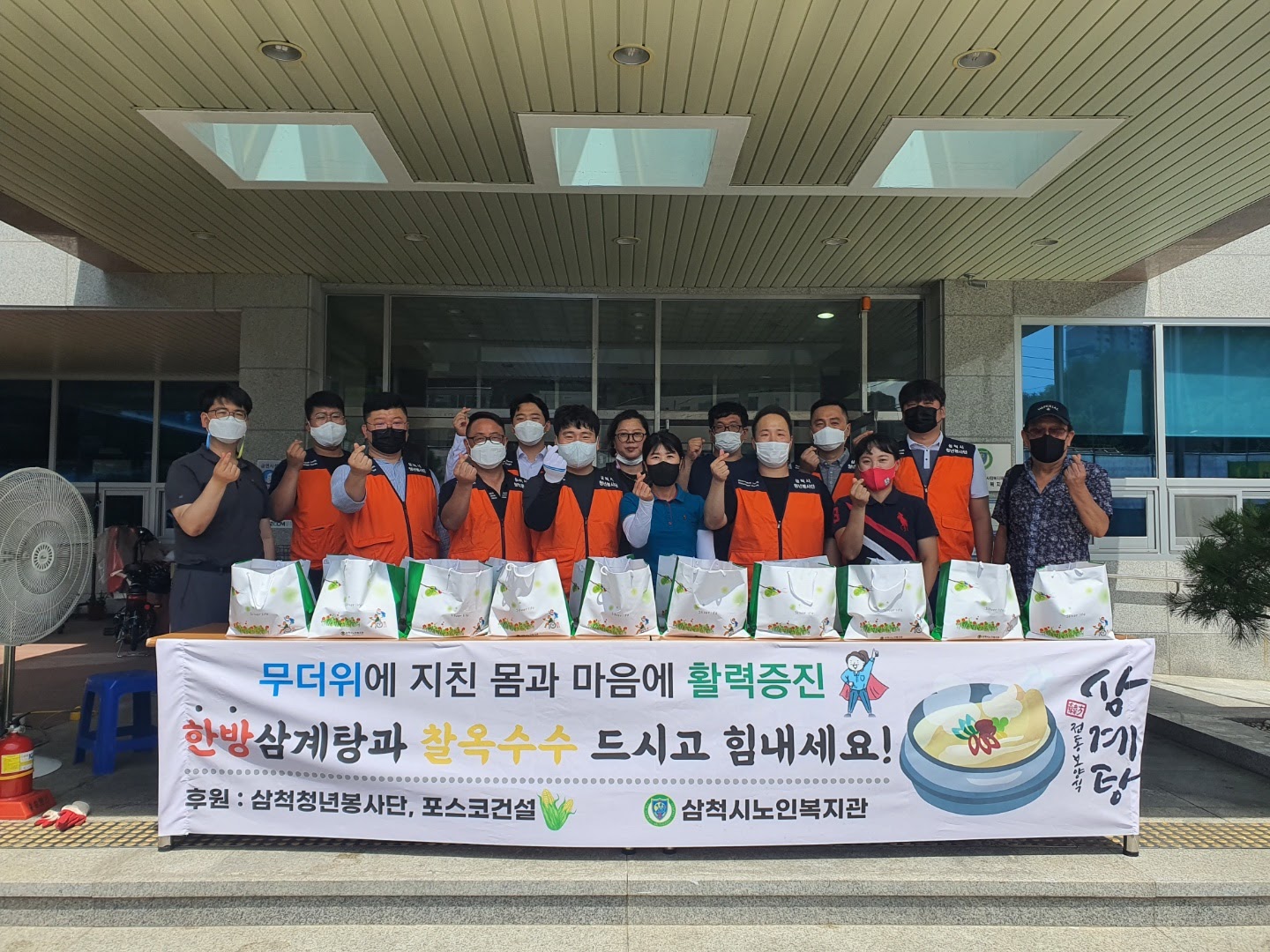 [강원사회복지신문 김종한 기자]=삼척시노인복지관에서는 지난 7월 21일 중복을 맞아 관내 저소득 독거 어르신 300명대상으로 '한방 삼계탕' 나눔행사를 가졌다. 이번 나눔 행사에는 삼척청년봉사단이 삼계탕을, 포스코건설토목프로젝트팀은 찰옥수수를 후원했다.