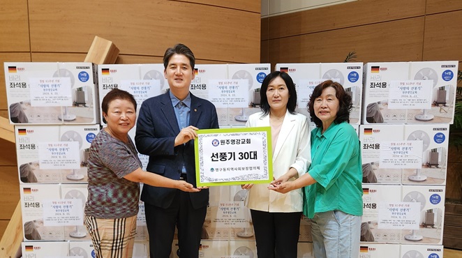 원주영강교회(담임목사 이섭)는 지난 7월 10일 원주시 행구동지역사회보장협의체(공동위원장 박영아, 강순예)에 선풍기 30대를 기탁하였다. 이날 기탁된 선풍기는 교회 창립 65주년을 맞아 교인들의 헌금으로 마련되었으며 행구동 소재 경로당과 폭염 취약 계층에게 전달될 예정이다. 아울러 원주영강교회는 매년 쌀과 라면 ...