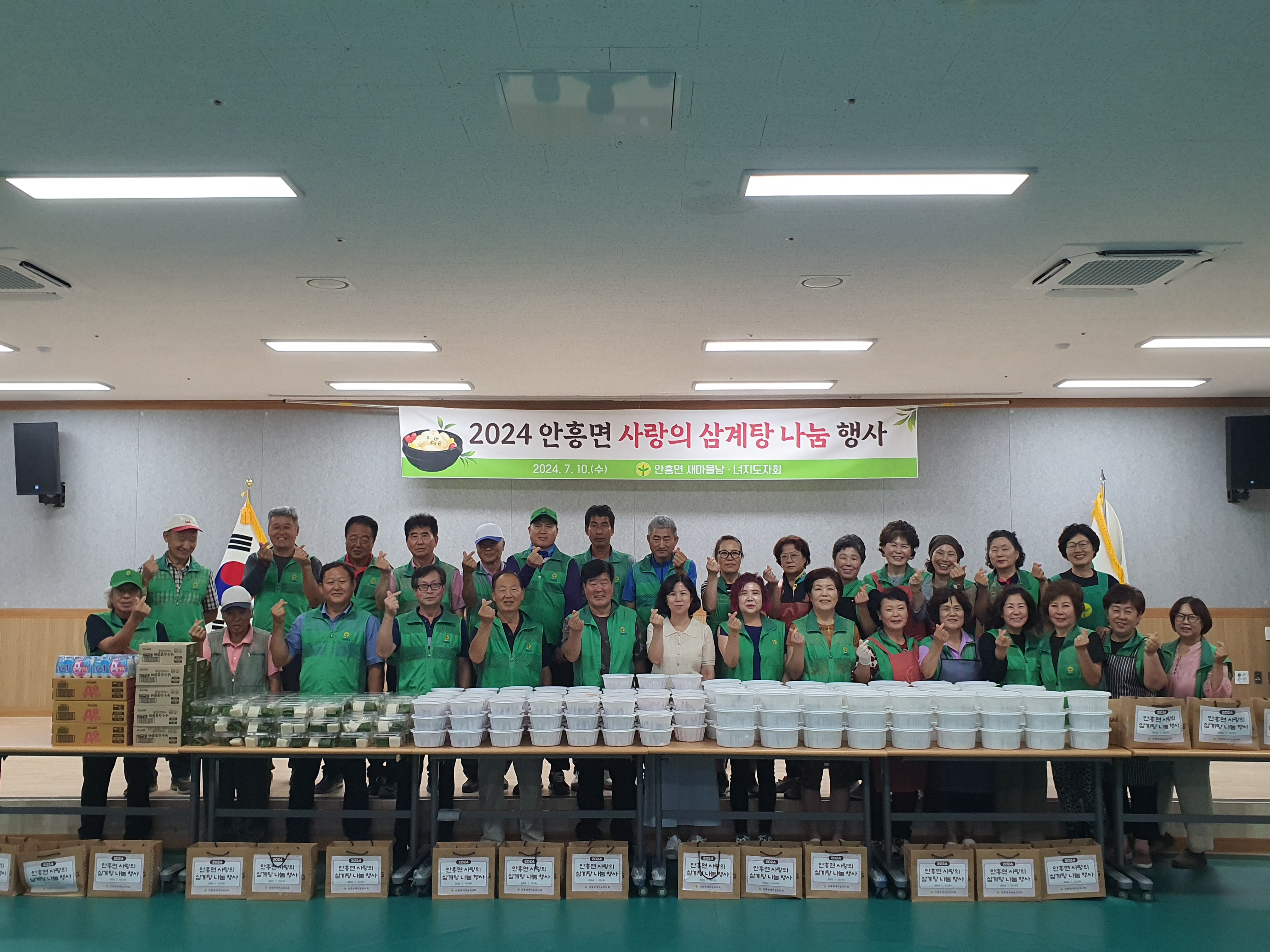 횡성군 안흥면 새마을남녀지도자회(회장 고종옥, 박인순)는 지난 7월 10일 ‘사랑의 삼계탕 나눔 행사’를 개최하여 안흥면 독거 어르신 100분에게 직접 조리한 삼계탕과 떡, 음료수 등을 집으로 배달했다. ‘사랑의 삼계탕 나눔 행사’에 참여한 안흥면새마을남녀지도자회 회원 34명은 정성스레 조리한 삼계탕을 어르신 가구...