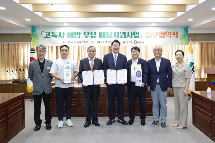 지난 7월 10일 오전 9시 30분 시청 투자상담실 고독사 예방 우유배달 지원사업을 통한 고독사 위험군 100가구 지원 원주시와 사단법인 ‘어르신의 안부를 묻는 우유 배달(이사장 호용한)’은 지난 7월 10일(수) 오전 9시 30분 시청 투자상담실에서 ‘고독사 예방 우유배달 지원사업’ 협약을 체결했다. 사회적 고립 위험이 있...