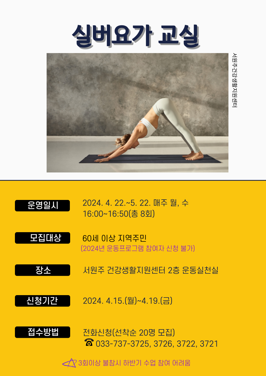 서원주 건강생활지원센터에서는 오는 4월 22일(월)부터 5월 22일(수)까지 매주 월요일과 수요일, 주 2회 ‘지역주민을 위한 실버요가 교실’을 운영한다. 실버요가는 실생활에서 할 수 있는 맨손 운동 및 소도구 활용 운동으로, 굳어있던 몸과 마음을 이완하고 몸의 균형과 근력강화·근손실 예방에 효과적이다. 60세 이상 지...