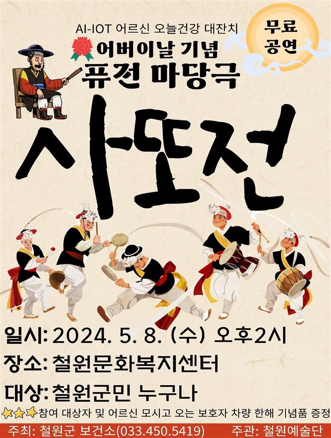 마당극 ‘사또전’과 함께 신명나게 놀고 건강 챙기세요 어버이날 기념 건강퓨전마당극 ‘사또전’이 오는 5월 8일 오후 2시 철원읍 철원문화복지센터에서 선보인다. ‘사또전’은 AI-IoT기반 어르신 건강관리사업 참여 대상자 및 지역 주민에게 다양한 건강증진 콘텐츠를 제공하는 내용으로 조선 중기 철원으로 신관 부임한...