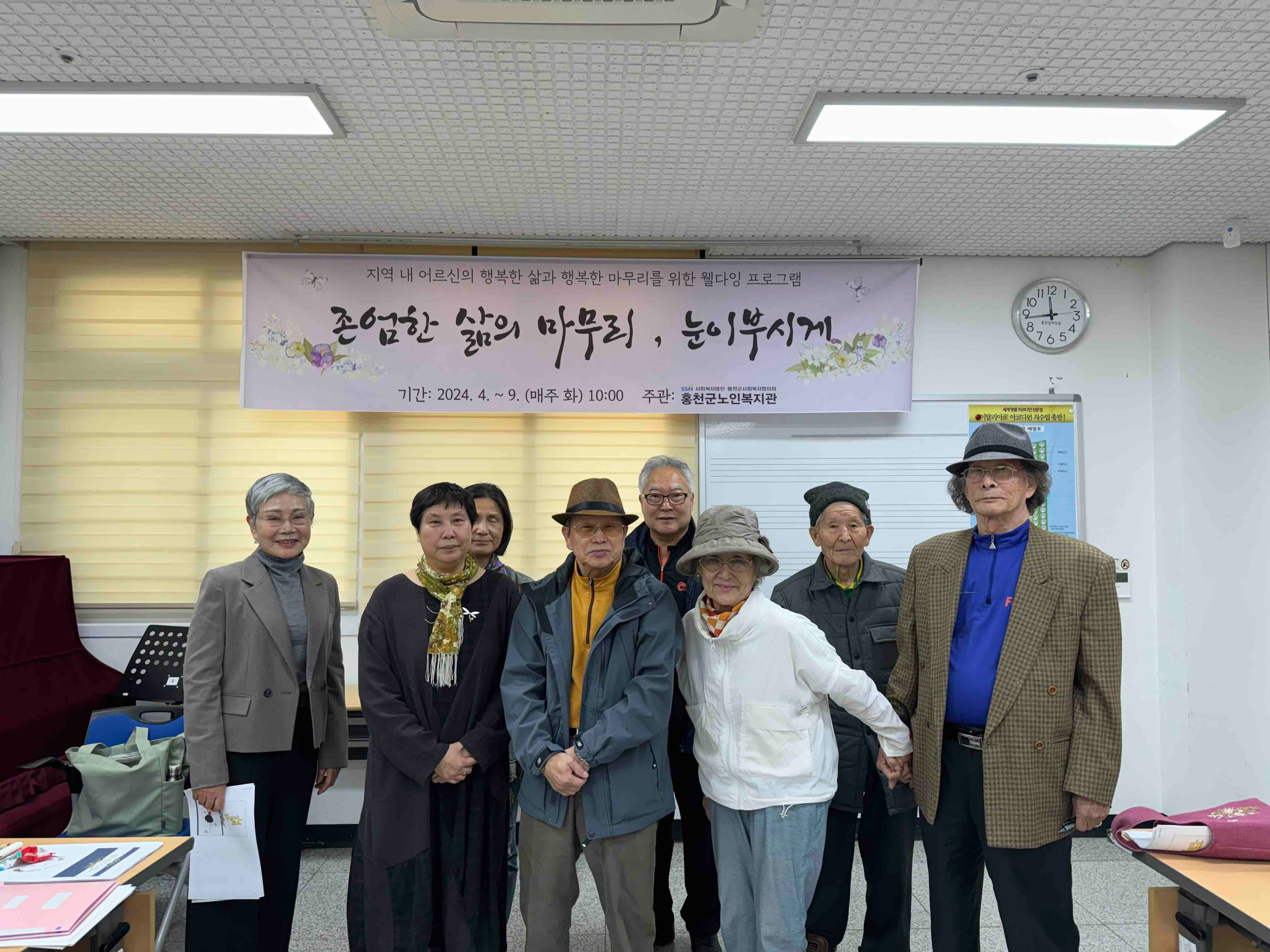 홍천군노인복지관(관장 현윤재)에서는 지난 4월 9일(화)부터 지역 내 어르신을 위한 웰다잉 프로그램 ‘존엄한 삶의 마무리, 눈이 부시게’ 사업을 시작했다. 본 프로그램은 죽음에 대한 인식 개선과 사별에 대한 치유를 목적으로 개설되어 웰다잉 교육, 미술·영화 치유 활동, 장묘문화 체험, 장수 사진 촬영 등의 다양한 프...