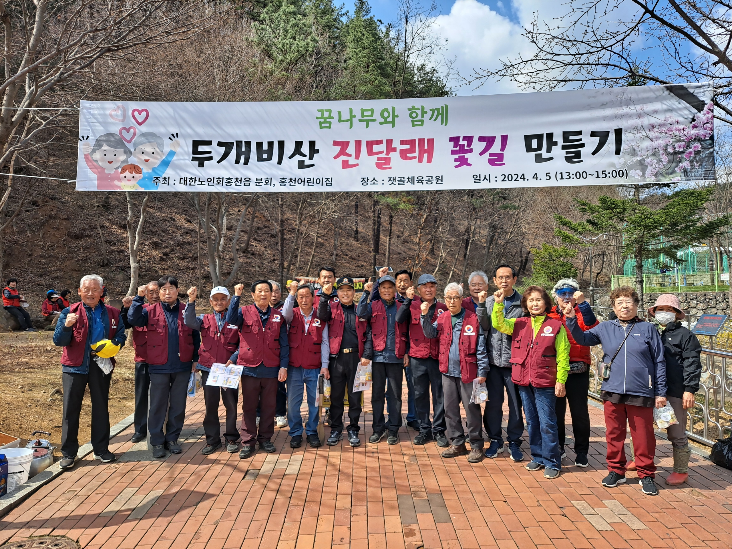 대한노인회 홍천읍분회(분회장 현종길)는 지난 4월 5일 식목일을 맞아 홍천읍 잿골생활체육공원에서 제79회 식목일 기념행사를 개최했다. 이날 행사에는 홍천읍 경로당 회원, 홍천어린이집 원생, 홍천읍 번영회 회원, 한빛봉사단 회원 등 100여 명이 참석하였다. 참가자들은 2023년 노인의 날에 이어 올해에도 홍천군의 군화...