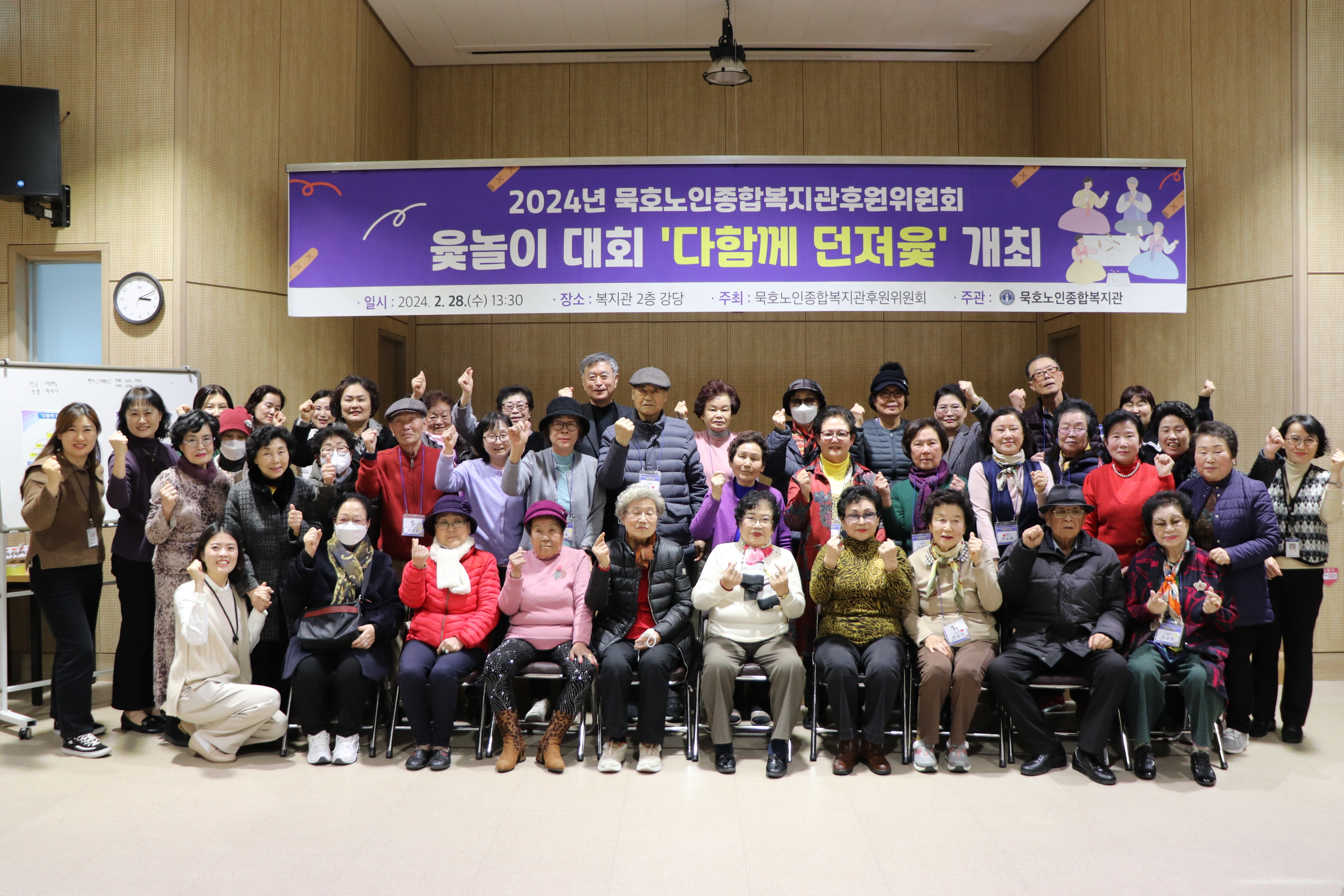 동해시 묵호노인종합복지관(관장 염규성)은 지난 2월 28일(수) 복지관 강당에서 2024년 정월 대보름 맞이 묵호노인종합복지관후원위원회 윷놀이대회 '다함께 던져 윷'을 개최했다고 밝혔다. 이번 행사는 묵호노인종합복지관후원위원회(회장 윤석여)가 주최하고 묵호노인종합복지관이 주관하여 후원위원회 40여명이 참석한 가...