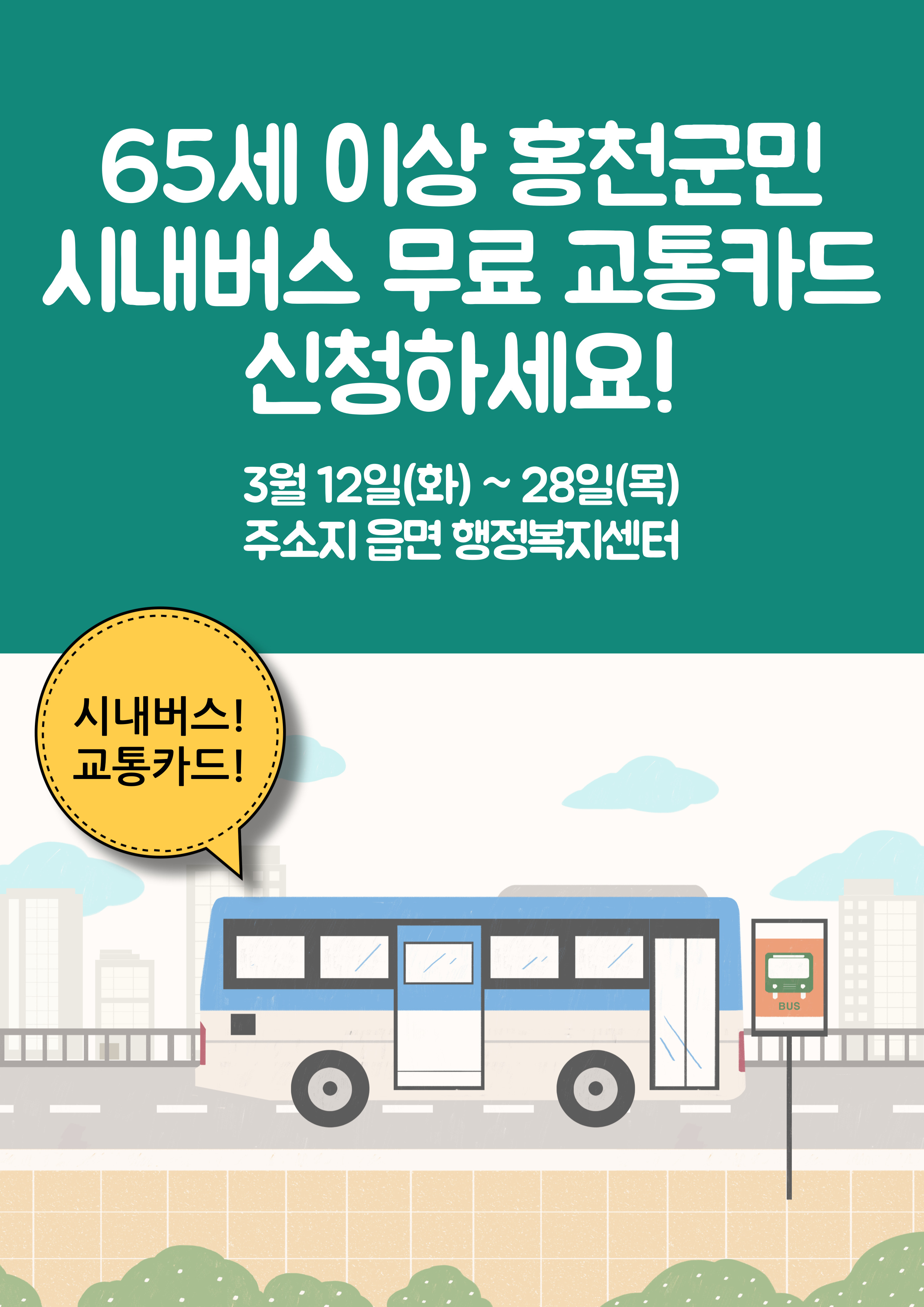 홍천군(군수 신영재)은 5월부터 65세 이상 군민을 대상으로 농어촌버스 무료 이용 서비스를 시행한다고 지난 2월 28일 밝혔다. 군은 이를 위해 오는 3월 12일(화)부터 3월 28일(목)까지 어르신 복지 교통카드를 신청받는다. 지원 대상은 홍천군에 주소를 둔 만 65세 이상 홍천군민(1959년 7월 31일 출생자까지)으로 각 읍면행...