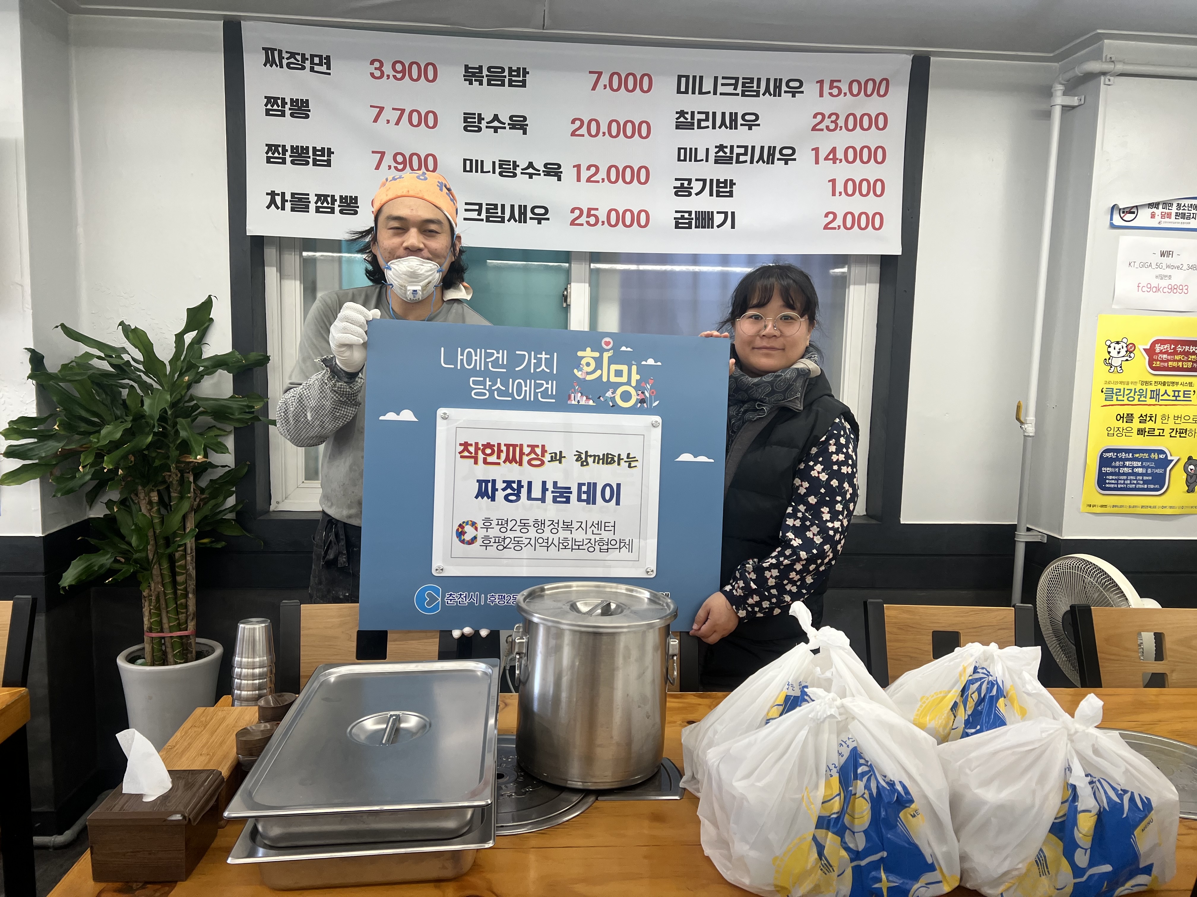 착한짜장(대표 곽성민)은 지난 11월 9일 나눔문화 확산을 위한 협약의 하나로 춘천시 후평2동 지역사회보장협의체(위원장 박정임)과 함께 후평 주공 5단지 경로당(회장 임정자)에 짜장면과 탕수육을 대접했다.