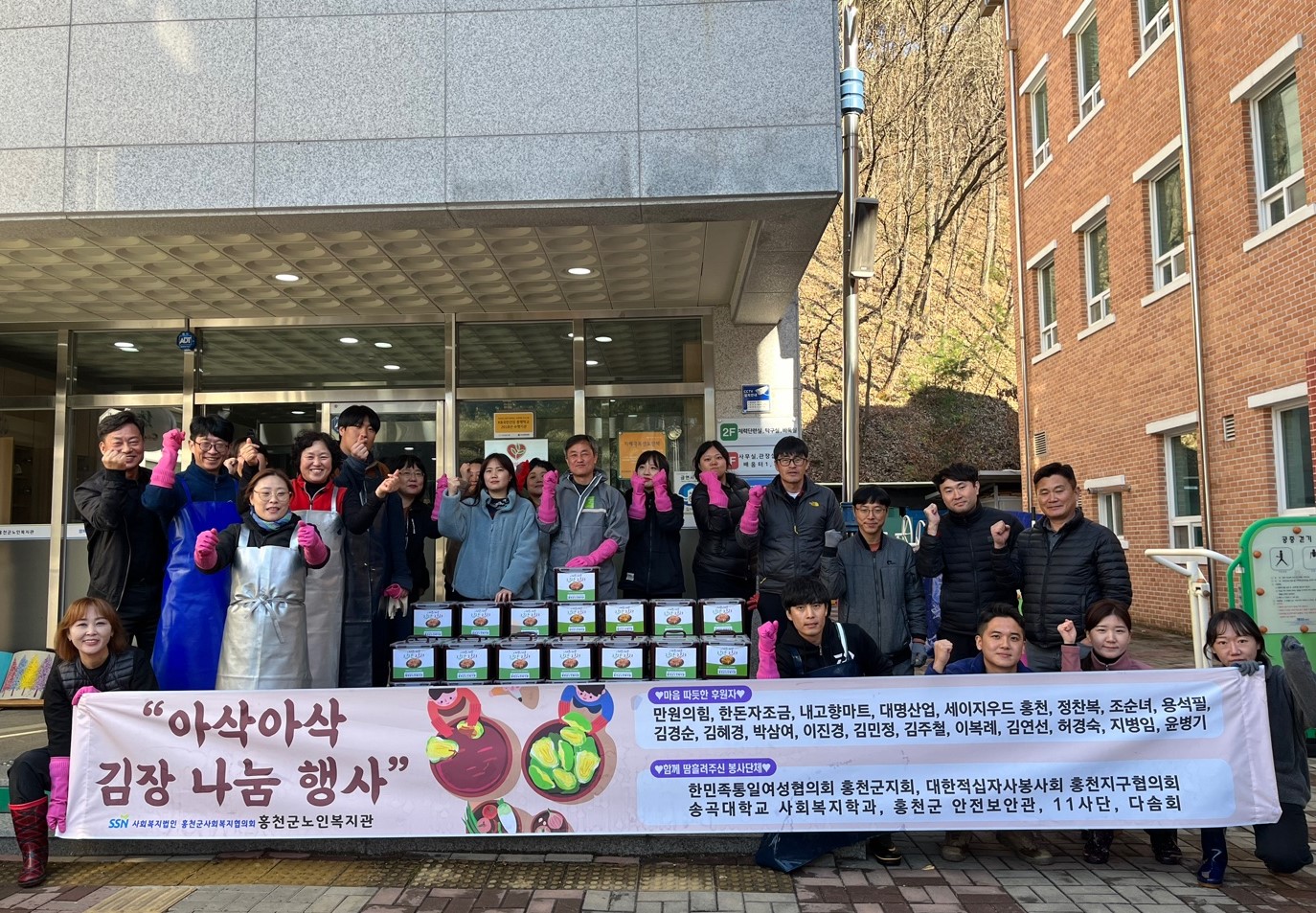 홍천군노인복지관(관장 현윤재)에서는 지난 11월 9일부터 10일까지 2일 동안 김장 김치 담그기 행사를 진행했다. 배추 세척부터 썰기, 절이기, 속 넣기, 버무리기, 포장 작업까지 진행되었으며, 자원봉사단체로는 한민족통일여성협의회 홍천군지회, 11기동사단 돌격대대, 대한적십자사 봉사회 홍천지구협의회, 다솜회, 송곡대...