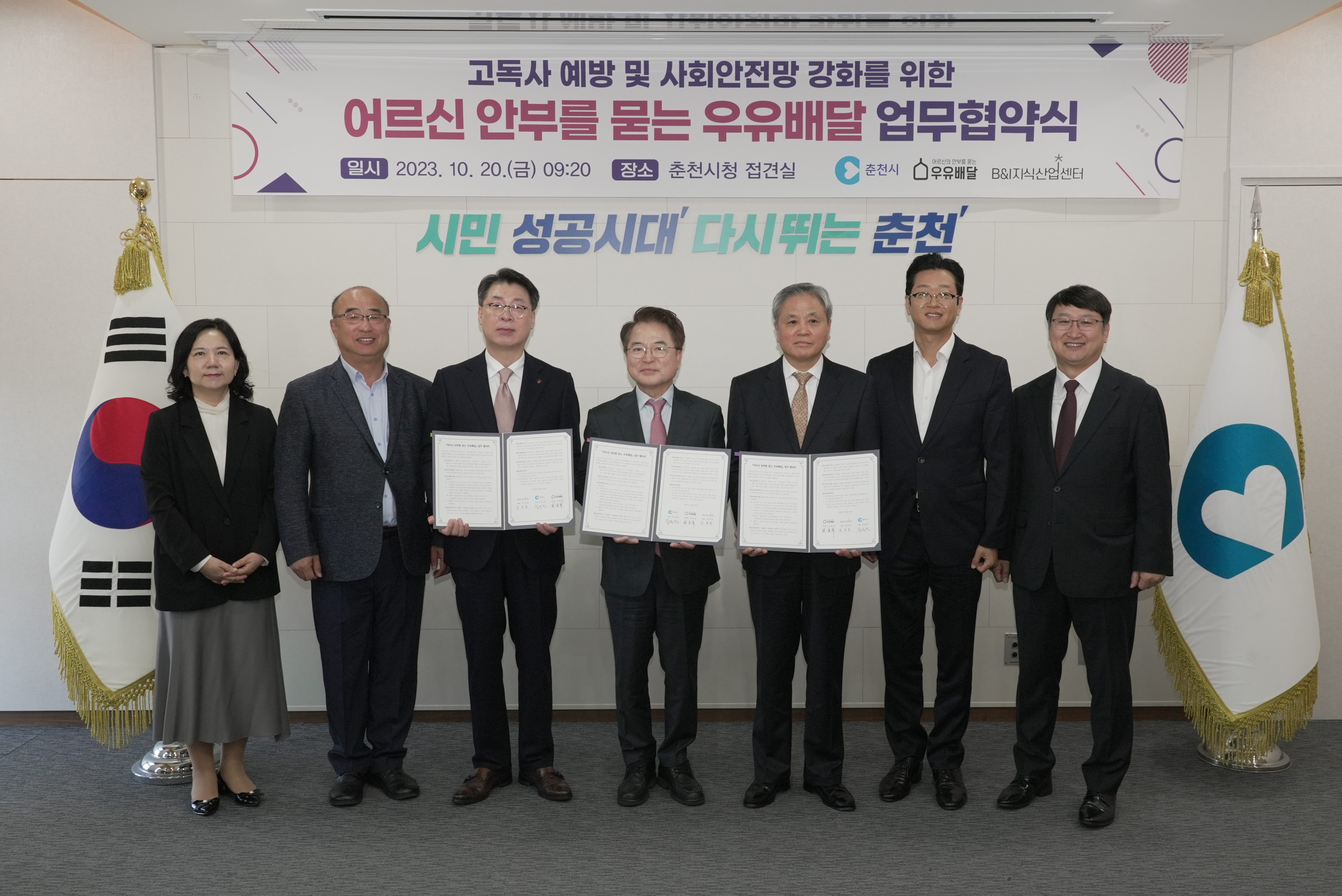 "우유로 어르신들 안부 확인해요" 춘천시가 지난 10월 20일 오전 9시 20분 접견실에서 사단법인 어르신의 안부를 묻는 우유배달(이하사단법인), B&I지식산업센터(이하 B&I)와 업무협약을 맺었다. 이번 업무협약을 통해 이르면 이달부터 저소득 독거 어르신 및 중장년 1인 가구 등 고독사 위험 가구 50가구에 주 3회(...