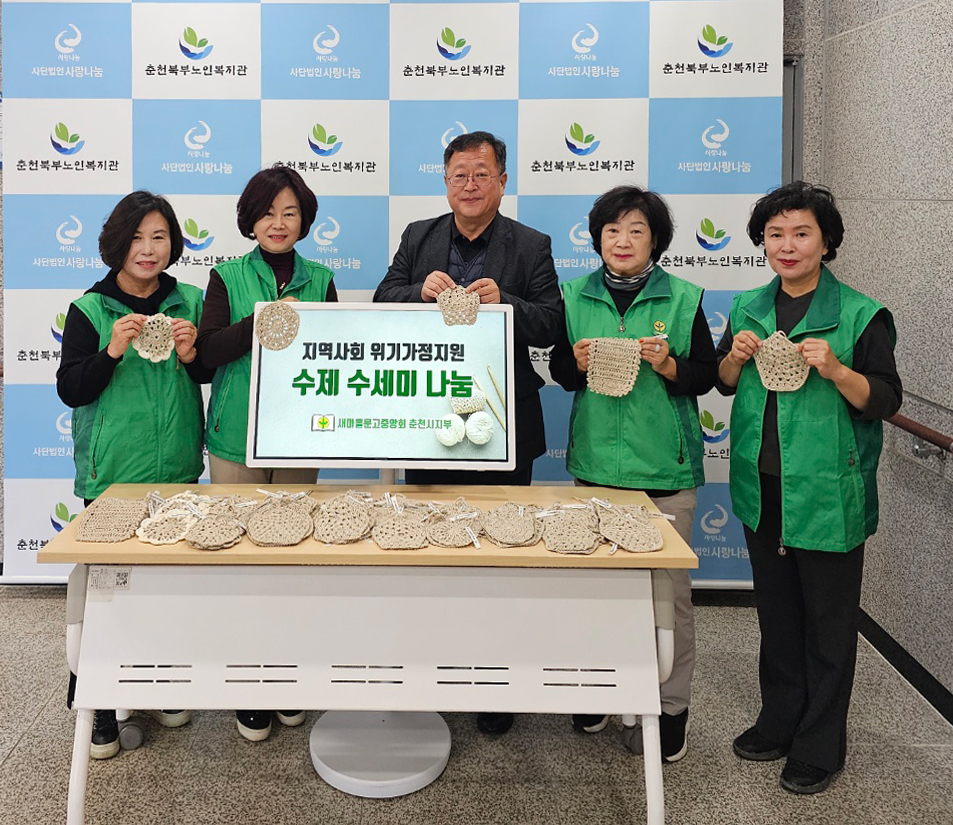 새마을문고중앙회 춘천시지부(회장 이희순)가 지난 10월 20일 오전 9시 춘천북부노인복지관(관장 박재호)에 정성을 가득 담아 손수 만든 환경 수제 삼베수세미를 전했다. 지난 6월 친환경EM비누 후원에 이어 환경을 지키고, 지역사회 위기가정도 돕기 위한 사랑나눔 실천의 일환으로 지속적으로 사랑을 전하고 있다. 새마을문...